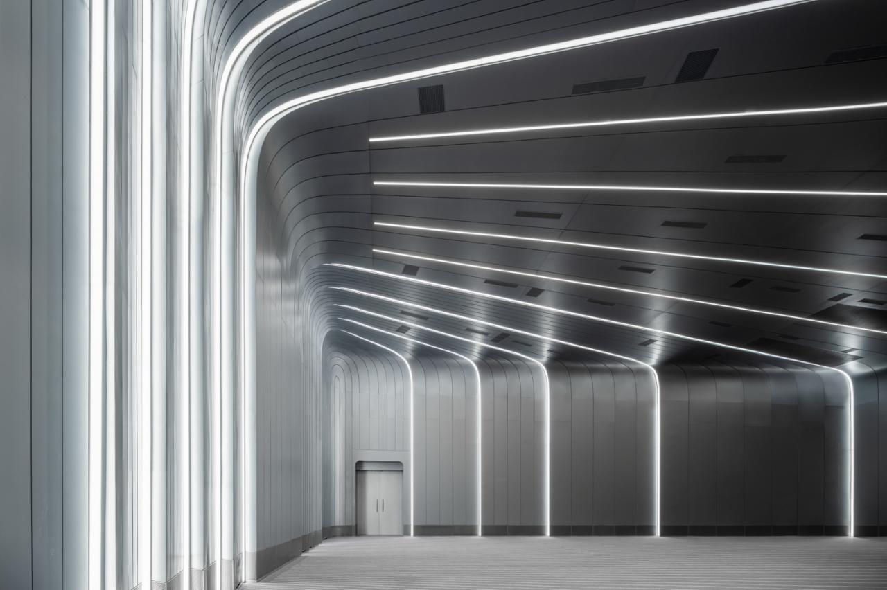 2769块形状、曲率各不相同的氟碳喷涂双曲蜂窝铝板,以“下搭上”的形式排布于屋顶的异形钢结构之上,形成疏密有致的银白色百叶,也有利于隐藏构造、收集雨水。夜晚,隐匿于屋面百叶板缝间的灯光与屋面线条同步舒展,动静相宜、相映成趣,既呼应着城市主干道川流不息的车流,也为城市增添了活力与动力。