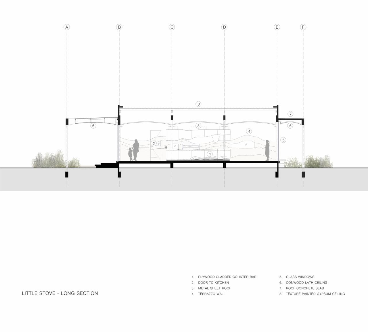 小火炉:咖啡店的曲线提取了伞的抽象轮廓;弯曲的屋顶线从外部遮篷持续延伸到内部天花板。室外座位区环绕着玻璃幕墙的后角。它被放置在一个4米高的大型天蓬下,提供舒适的遮阳,从而鼓励访客使用户外座椅,使游客更接近宽敞的户外花园,俯瞰安静的水道和榕树。