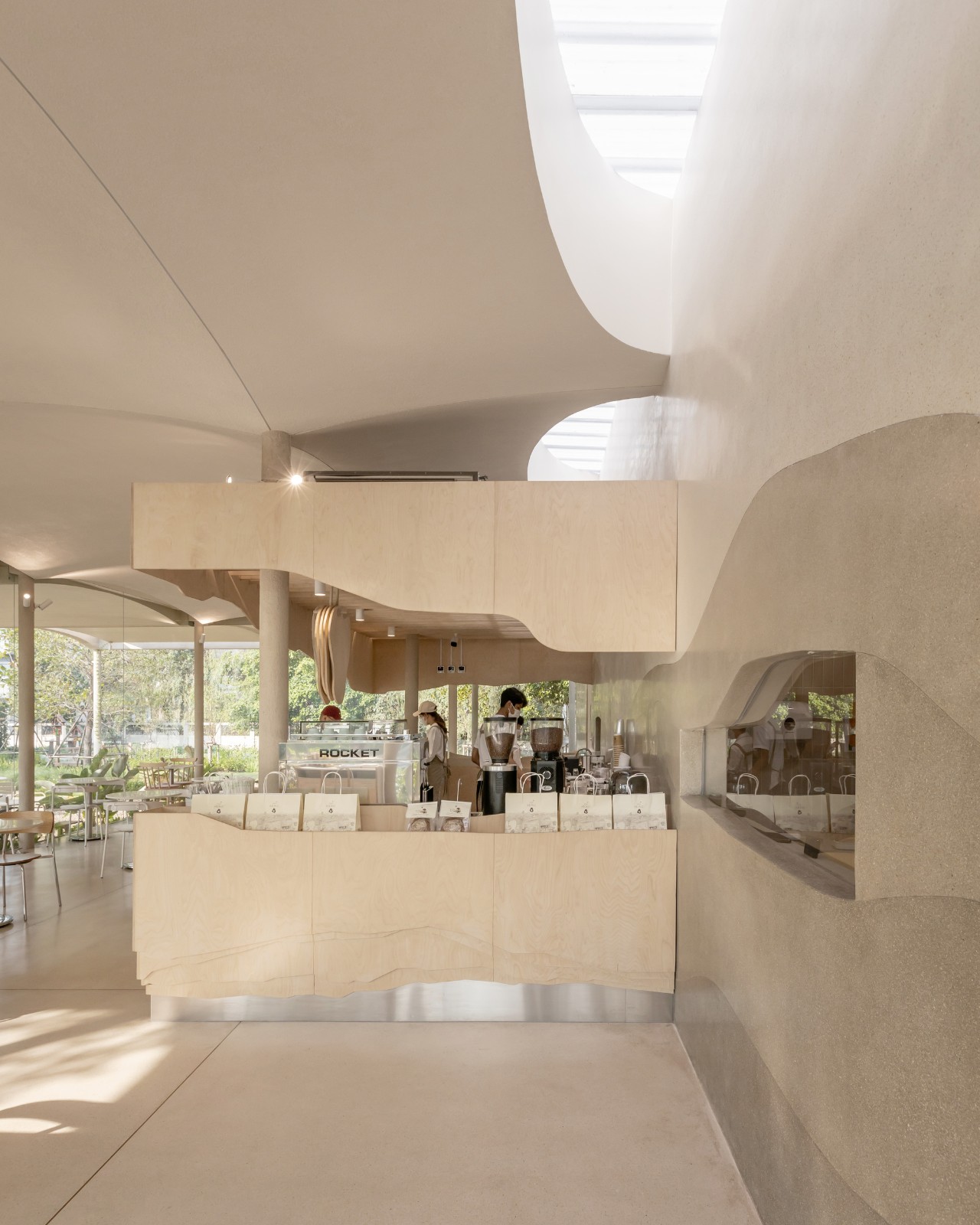 天窗是天花板曲面的椭圆形切口。这些孔为室内带来自然光,并突显手绘分层水磨石。主内墙将主座位区和展示柜台与服务厨房和烘焙室分开。展示柜台居中并与3个玻璃幕墙对齐,使室内和室外座位区都能获得广角视野。