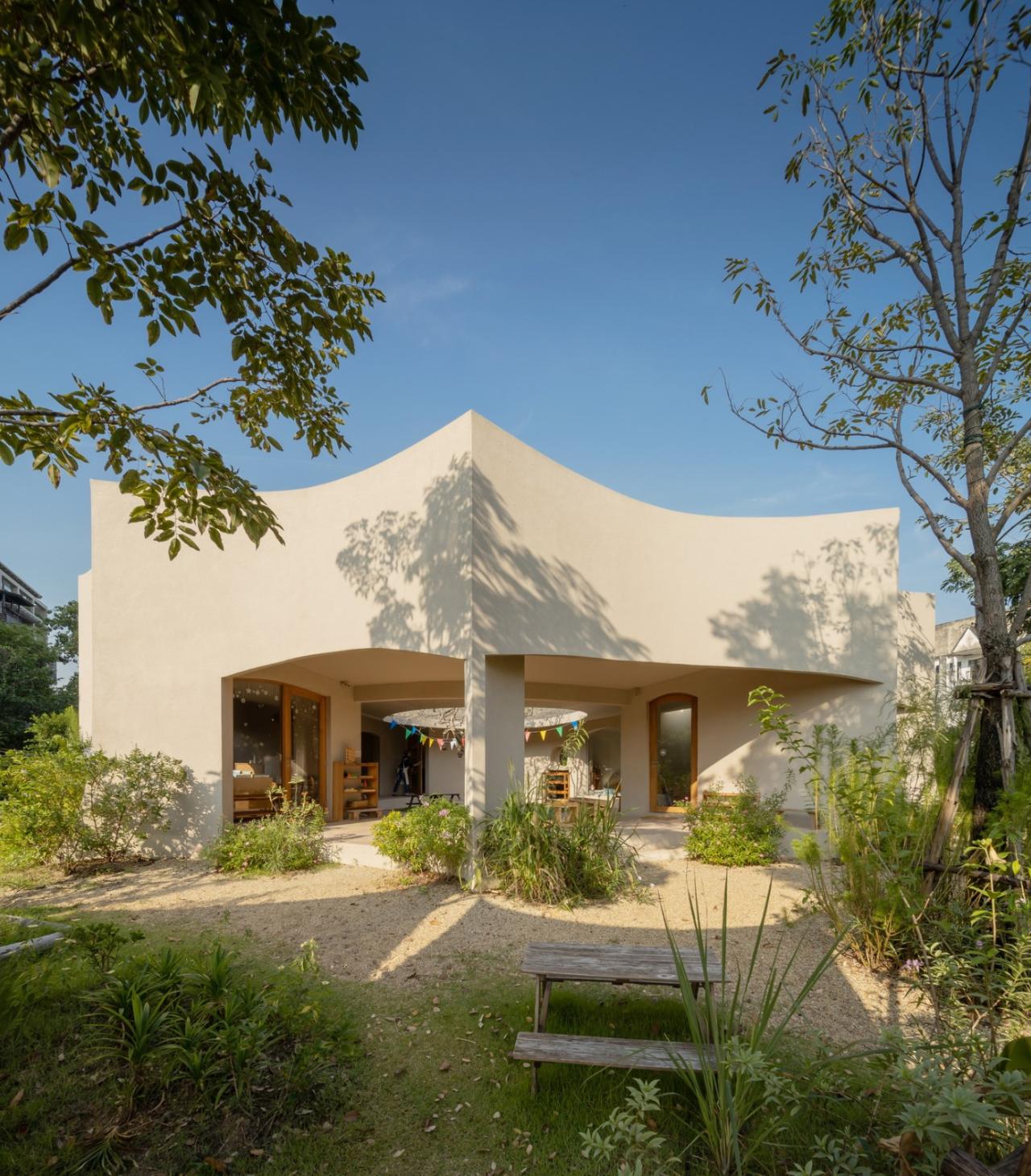 小火炉&小树桩是一家面包/咖啡店,以及一个室内和室外的游乐场,坐落在曼谷郊区一块4600平方米的土地上,毗邻运河。从一条最初被称为“Soi Wat Yai Rom”的小巷进入该场地,在泰语中,这条小巷被称为祖母伞庙巷。泰语单词“Rom”是伞和遮蔽区的同音词。这两种含义成为该复合建筑设计语言的灵感来源。咖啡店和游乐场共享一个落客区,连接人行道,38个停车位,以及一个独立的洗手间小屋。