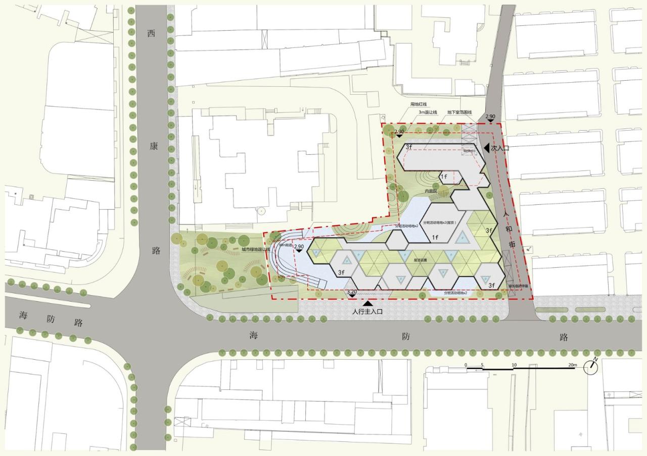 在幼儿园回访现场,我们也记录下落成后幼儿园的平面,与方案设计阶段的平面对照,虽发生一些明显的调整,仍遵循了六边形单元体为主的“启蒙几何”设计策略。