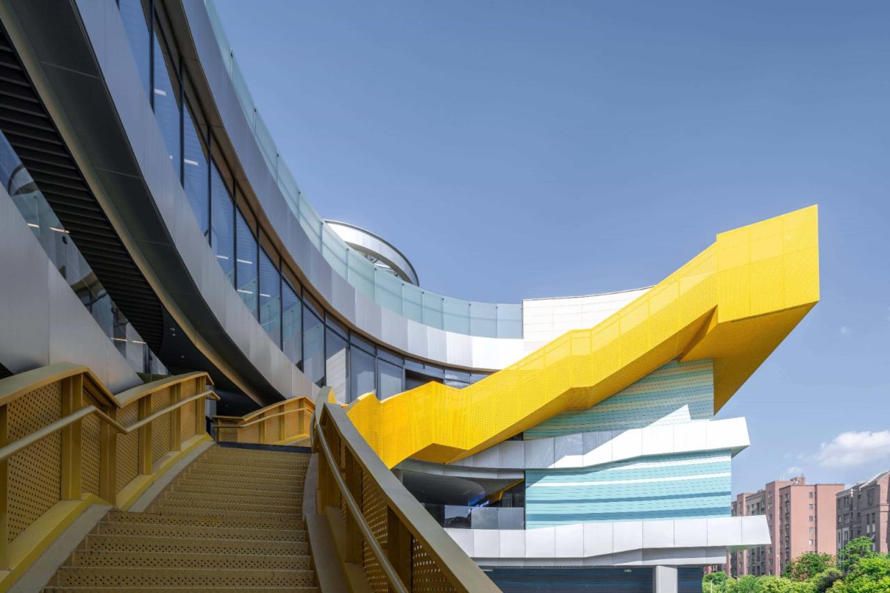 我希望站在中庭里的人能感受到阳光照下来的喜悦,做一个彩虹山谷!地面就简单一些,做一个灰色调的渐变。南侧立面的大楼梯则是用了明艳的黄色,当我看到年轻人站在楼梯上拍照记录心情的时候,我还是很欣喜的。