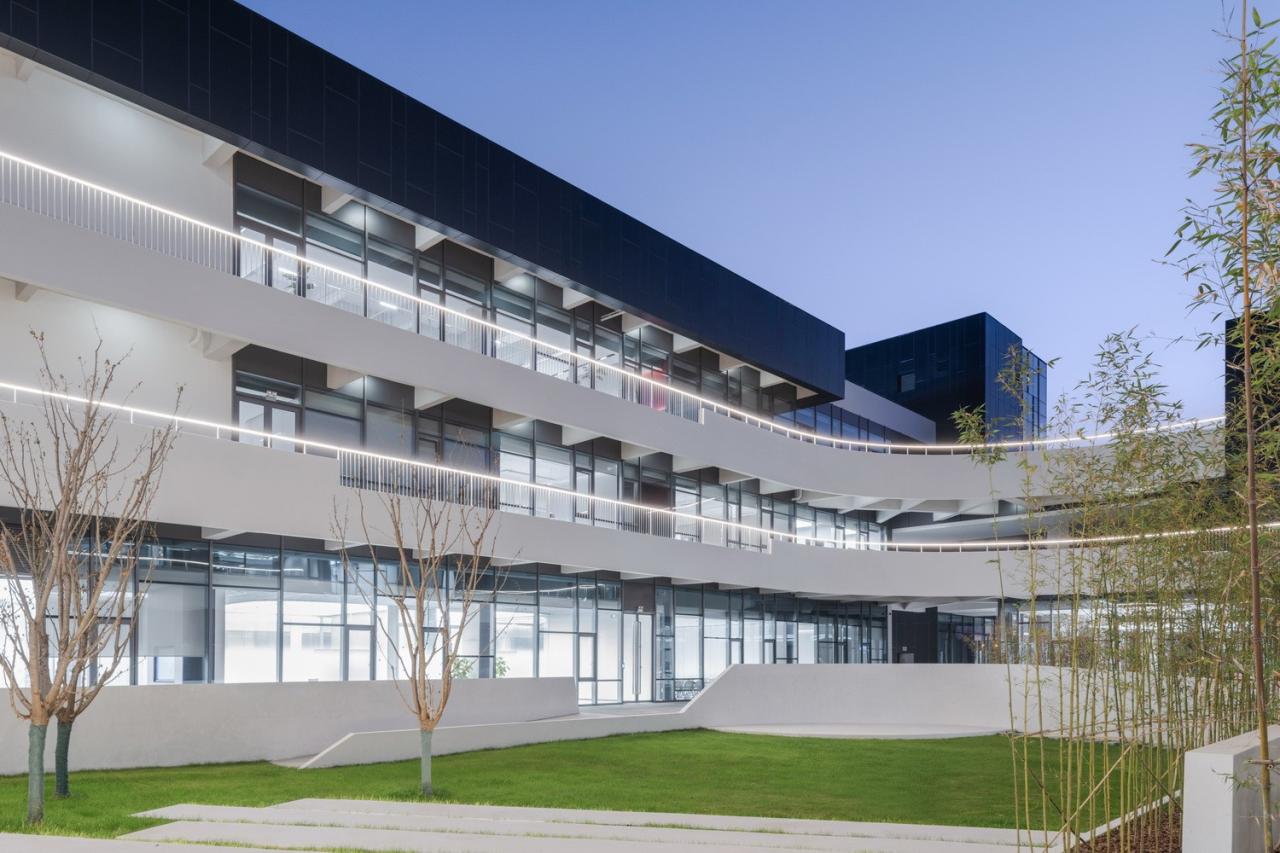 室外材料的色调延伸到生产厂房的外墙。垂直方向的渐变为水平体量提供了视觉韵律,同时与窗饰设计相融合。厂房内部采用大量天窗照明。生产线在几乎零粉尘的室内环境中运行。景观设计基于海绵城市的理念,借助自然雨水的地下渗透。大型水景和起伏的地面景观打破场地本身的单调感。建筑南侧种植了大量树木。随着时间的推移,这些树木将逐渐长大,为停车区提供遮阳,并为研发中心的主立面提供视觉缓冲。