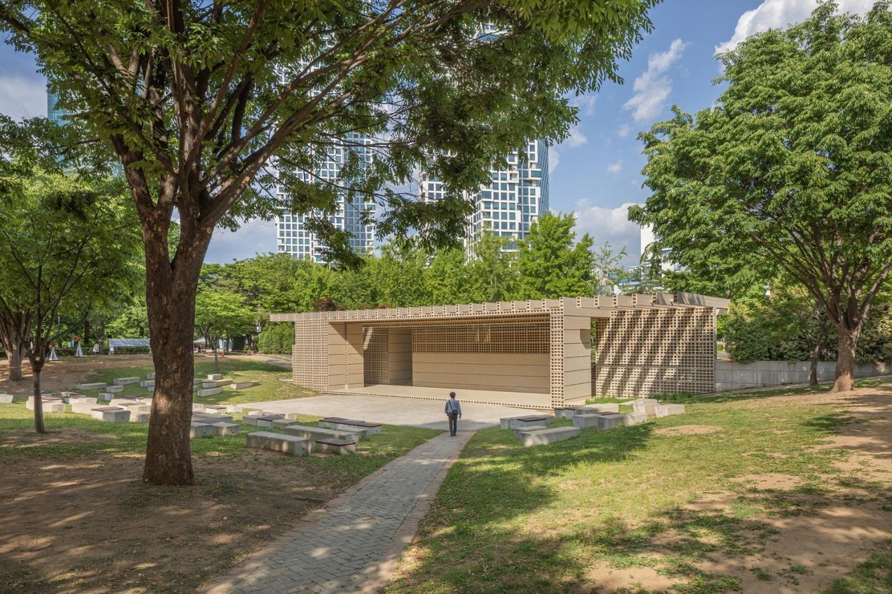 “生态矩阵,呼吸网”具有一种松散的几何秩序,连接各种关系。首尔森林中的原建筑非常僵硬且功能化。旧舞台将步道和公园、前后方分隔开来。通过将舞台重新定位于中心位置,“生态矩阵,呼吸网”连接了建筑周围四条不同的路线和两个休息点。新的设施现在被视为一种中性的形式,结合并构建了关系。