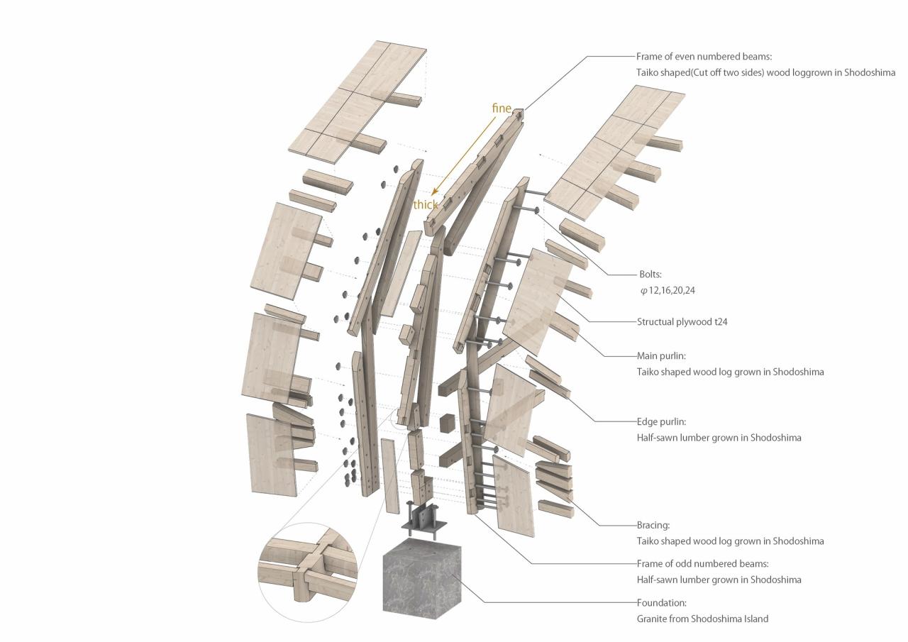 在结构上,复杂切割的端部构件被预先组装成弧形原木的部分单元。半锯木材和圆木交替组合并用螺栓固定在一起,以传递应力。木材直径设定为150至200毫米,这样规格的木材在小豆岛上易于获取,而长度则根据数控机床的最大切割能力设定为2.5米以下。这些规格接近垂直载荷的轴向力系统,并减少了推力。这样的设计既考虑了材料的可得性,又确保了结构的稳定性和效率。