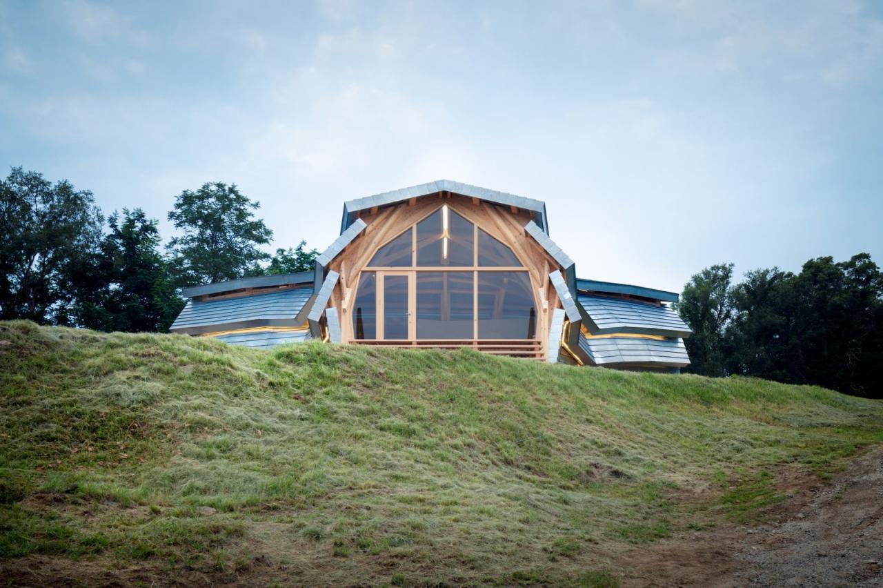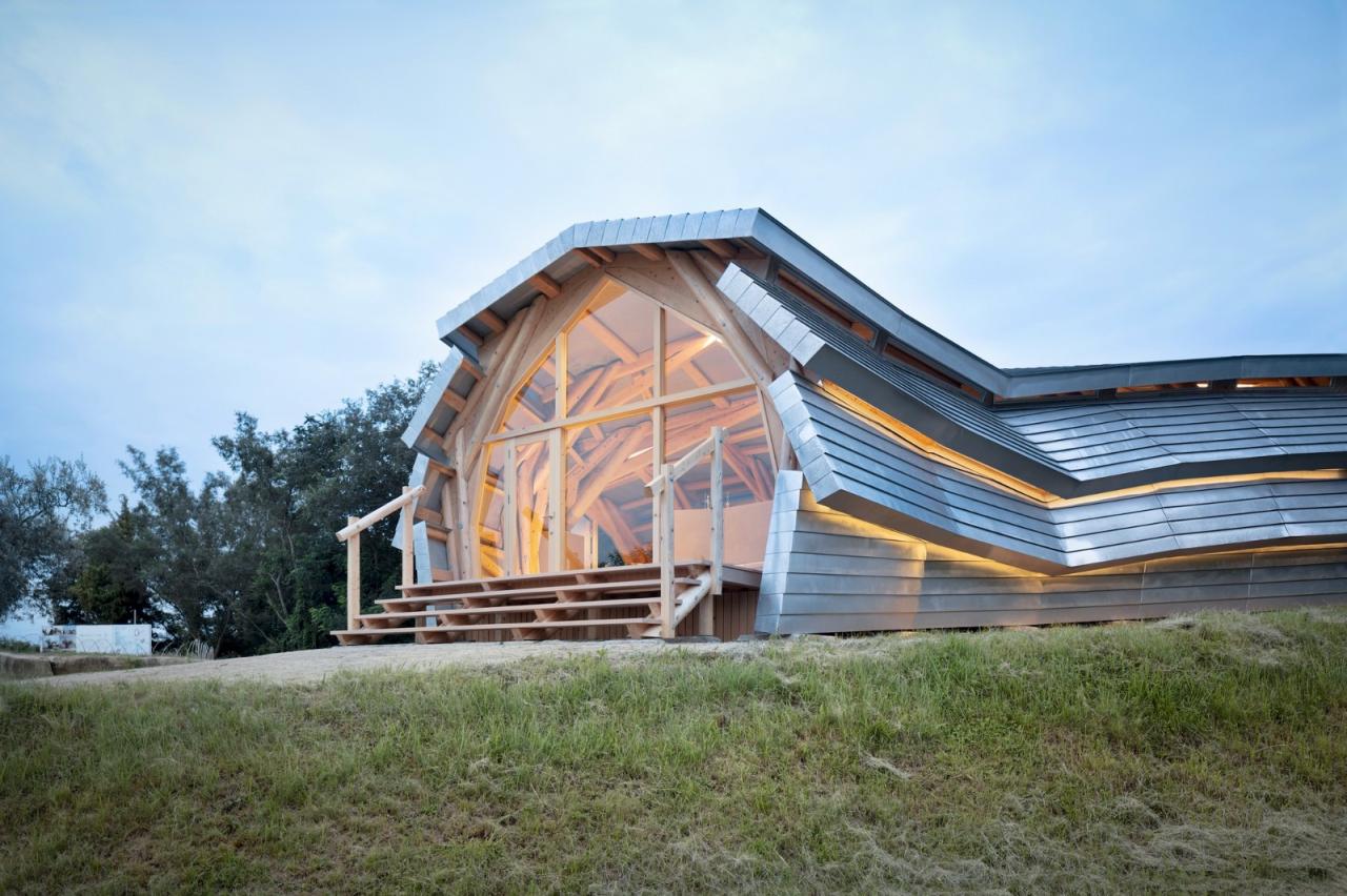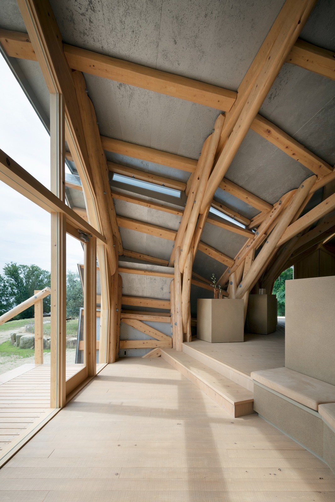 即使入口门关闭,也可以始终感受到约0.3米/秒的轻柔气流。建筑基础采用该地区的巨大花岗岩石,而非混凝土。结构框架使用了该地区的600根柏木。