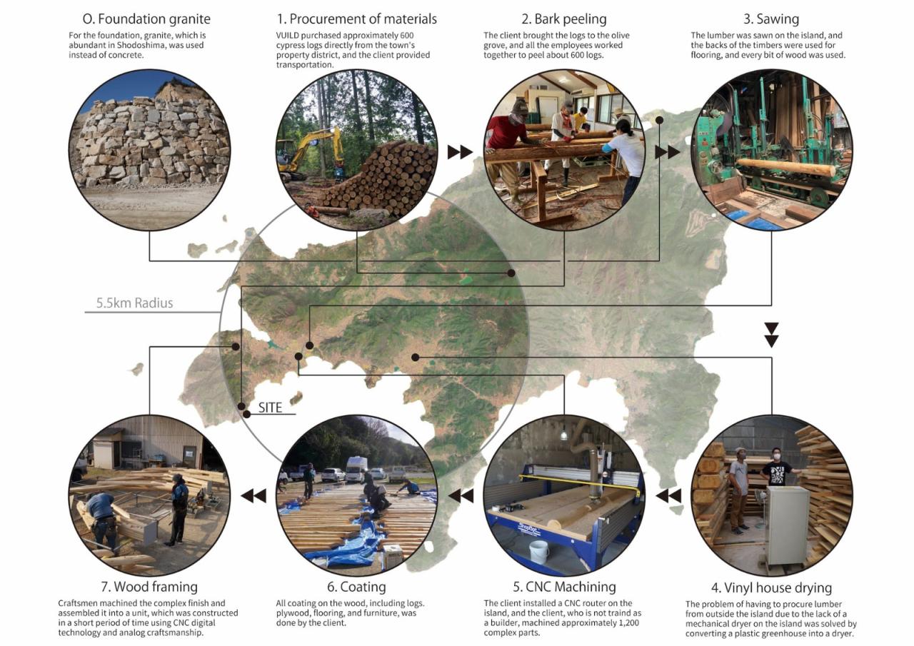 设计挑战-小豆岛位于日本西部,距大阪西部180公里。因为岛上缺乏干燥和加工设施,在这个岛上设计木结构建筑时,木材往往是从本州岛运输而来,成本很高。VUILD建议通过将塑料温室改造成干燥机,并安装小型数控加工机,利用岛上现有的柏树。客户同意采购材料并亲自动手建造设施,合作完成了这个项目,这对当地社区和全球环境都产生有利影响。