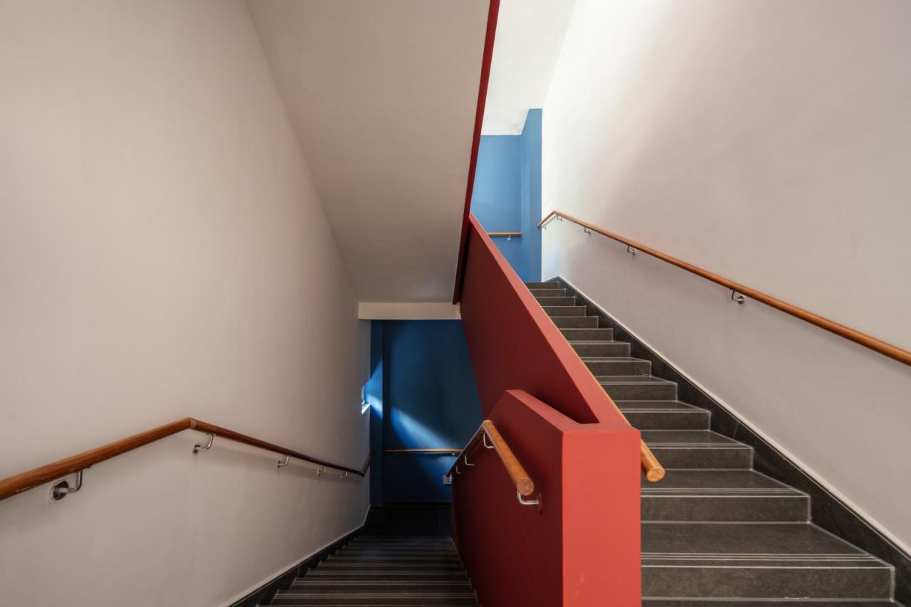 安全性是适老化设计的关键,改造目标为打造有适老化细节的建筑空间。原建筑内由于高低地势而建造的陡峭台阶对于养老居住并不合理。因此,改造时移动楼梯间至场地中心,并配置一台可达屋面层的电梯联系各个空间,垂直交通动线的方式解决了老人上下楼的问题。