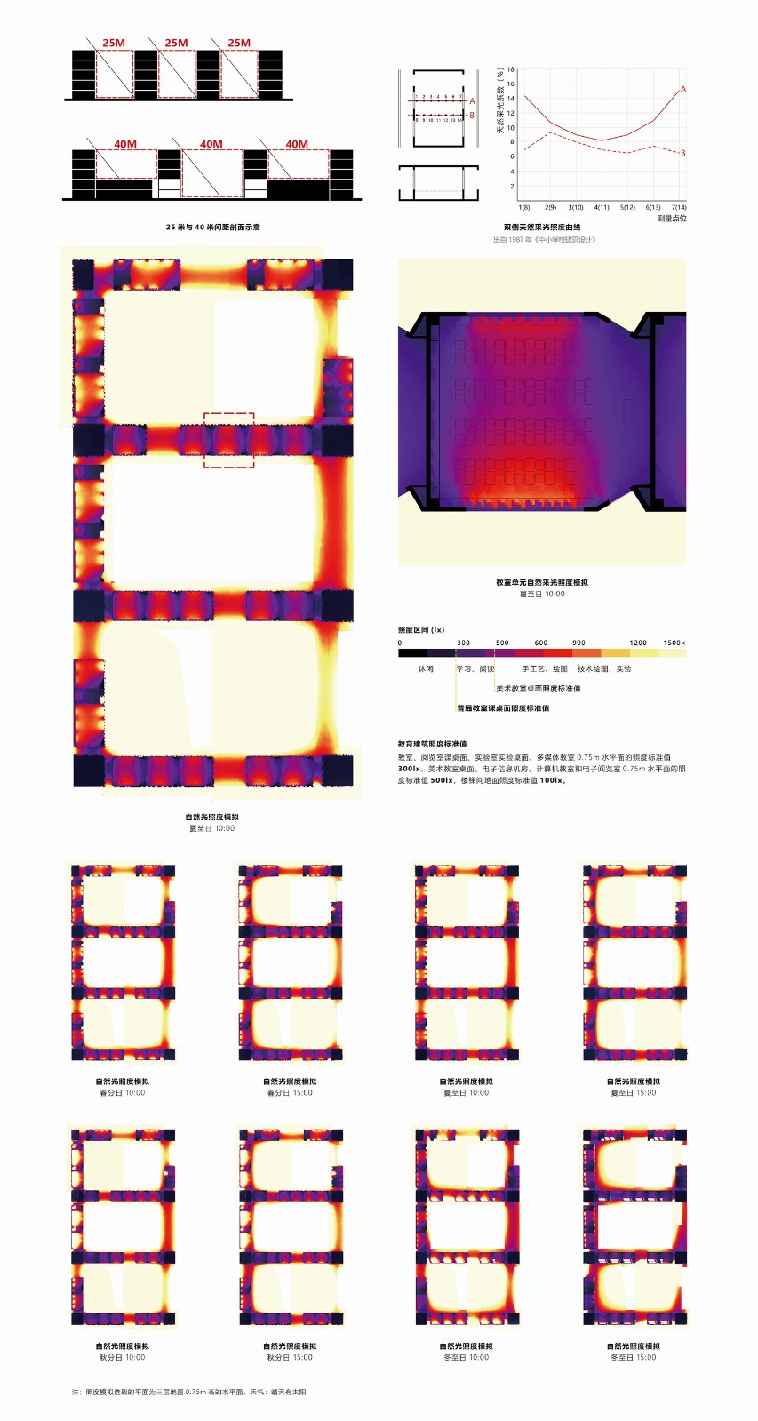 然而化解策略不在改弦易张,而与规范的重新调和,回到制定这些物理条件的本身——也就是在维持大规模化、大班教育的前提下,如何更新“普通学校”的基本性能。比如南北双廊带来更稳定的双向均匀采光,大部分时间利用自然光就可以达到室内教学的照度要求;对称门窗的布置具备良好自然通风,也带来更稳定的内部布局,更良好的课桌与黑板的视线关系以及日常的收纳储藏;40m宽的空中内院(multi-datum)[4] 不仅为学生在课间提供了充沛的活动场地,也有效地降低了前后排教室之间噪音干扰。