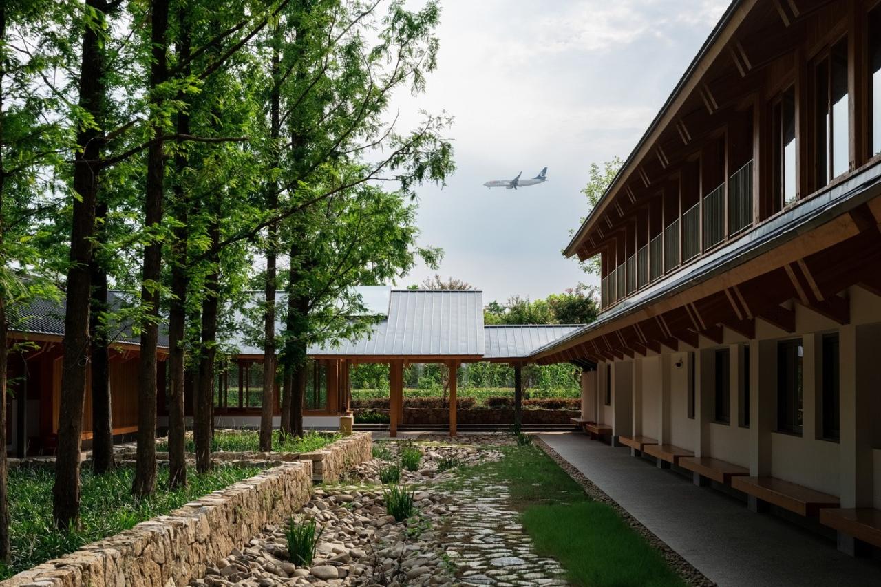 遵循于平实、庸常中接纳使用者的自在及参与的设计初衷,构造与材质的处理于温馨细腻中体现对于使用者的关怀。砖混结构基座施以白色肌理漆,上部是直接露明的木结构梁柱、望板、并结合木挂板的外立面处理。这种内外一致形成了外部界面结合环境、内部空间自然温润的体验感受。深出檐的坡屋顶采用哑光深灰色或银灰色的钛锌板或铝镁锰板金属屋面系统。