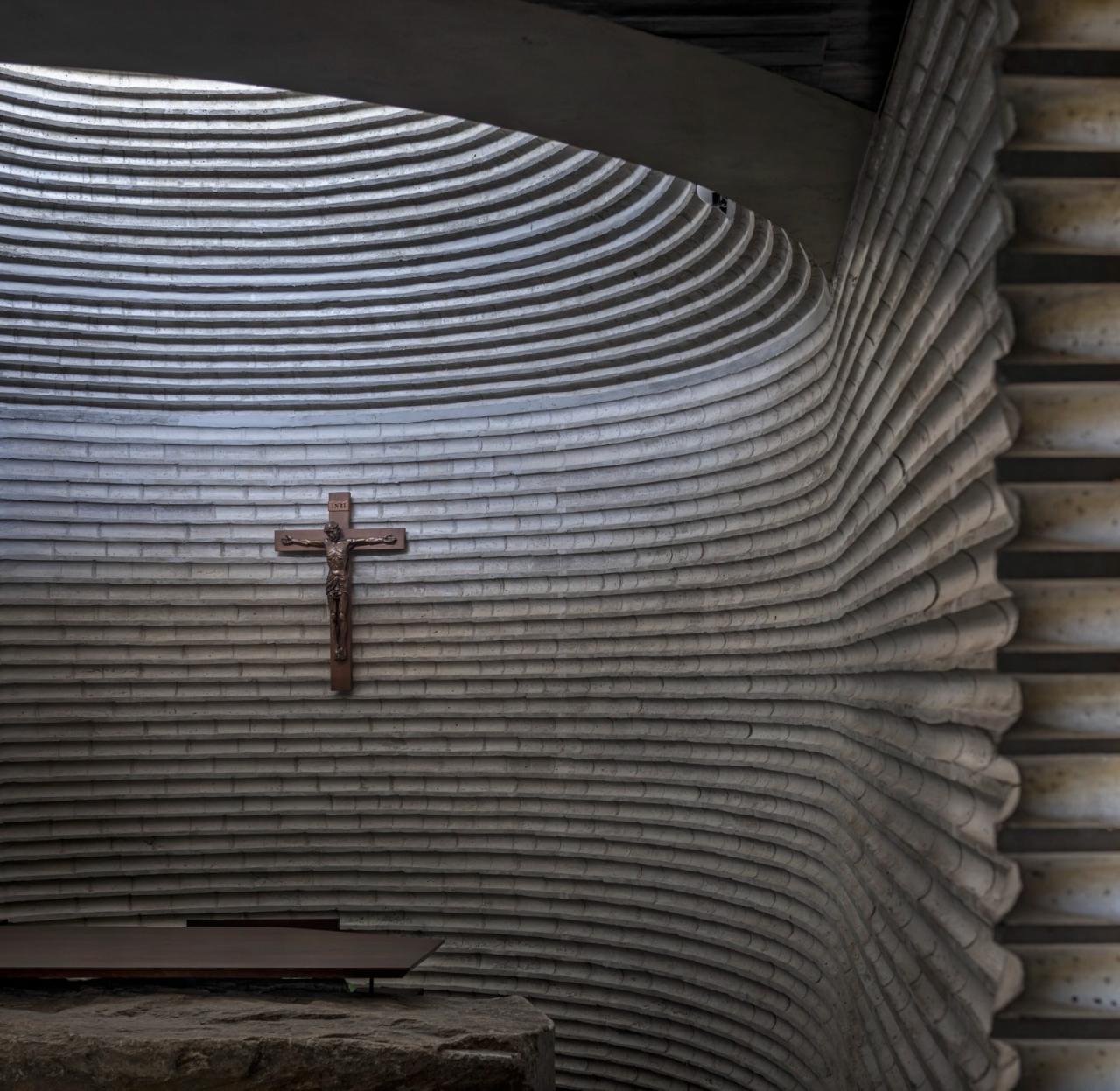 当访客穿过蜿蜒狭窄的走廊进入礼拜堂内部时,人们会逐渐适应黑暗,直到最终在黑暗的空间里相遇。这条走廊两侧的墙壁是用竹片压印图案制成的。这种图案是由直径60毫米的竹子切割拼接而成,考虑到孤立的场地位置和预算,这是通过精细的手工制作而非金属模具完成的。墙壁内外连续的横向纹理在环绕祭坛一周后重新汇合。所有访客都将能够通过这座礼拜堂欣赏到崔神父在孤独夜晚旅程中的奉献精神,这座礼拜堂向所有人开放,任何人无论宗教信仰如何,都能在此刻进行自我反思,并与周围的风景融为一体。
