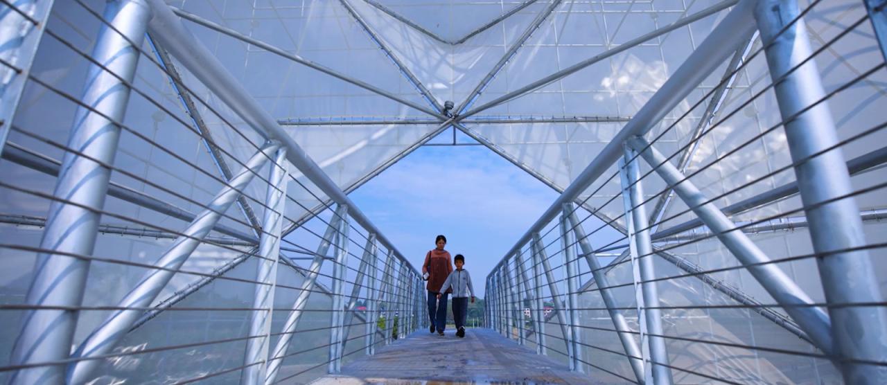 关于材料在材料和构造上也向基础设施学习,谨慎地选择简洁实用的材料,不设计过于精细复杂的构造节点,以确保施工方便和后期维护的便捷。网格膜材料轻盈透风,日常使用时能提供良好的通风效果,在极端天气情况下,如台风天,能降低风荷载保障结构安全。银粉漆作为主要涂料,所有钢结构构件和原有水闸房立面均统一刷涂,以强化“人造树”整体的雕塑感,在自然景观原本较为单一低调的入口区域,形成有力的标识作用。此外,银粉漆有利于光线反射,与半透明的网格膜共同渲染出层次丰富的照明效果。
