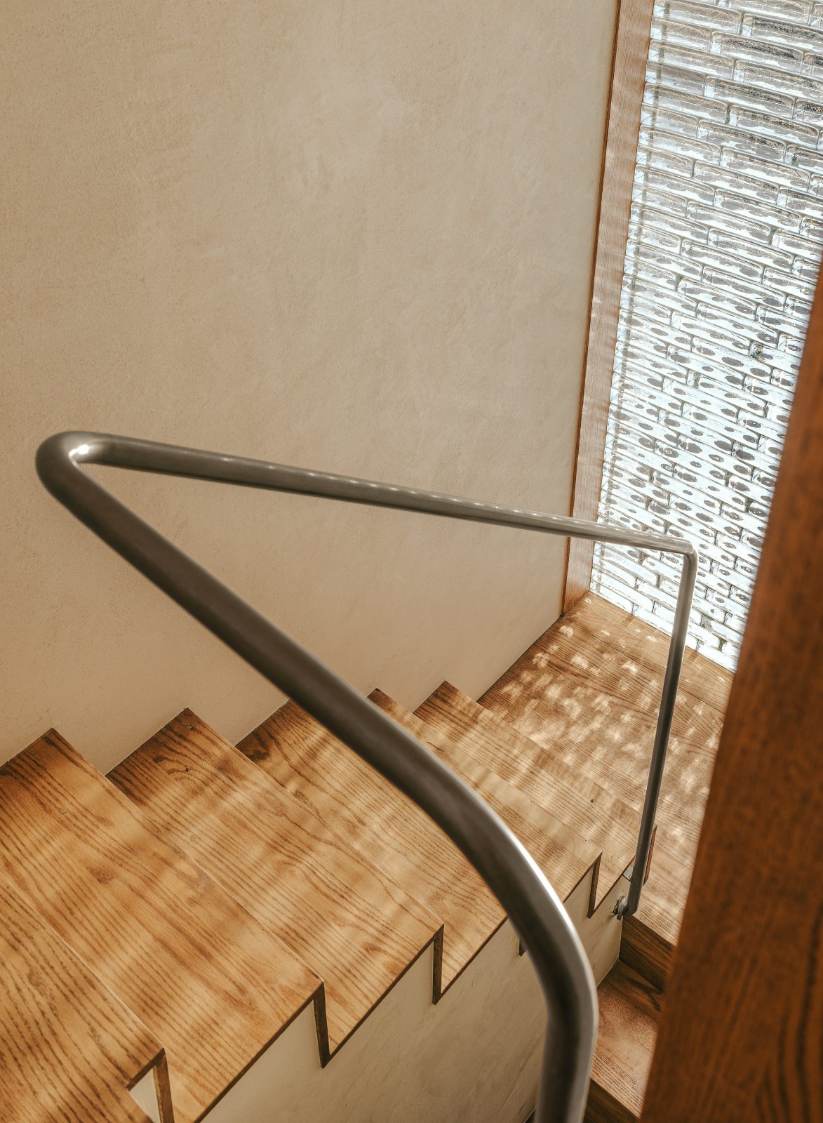 ▲楼梯间转角处的玻璃砖墙与黄铜扶手 ©朱雨蒙