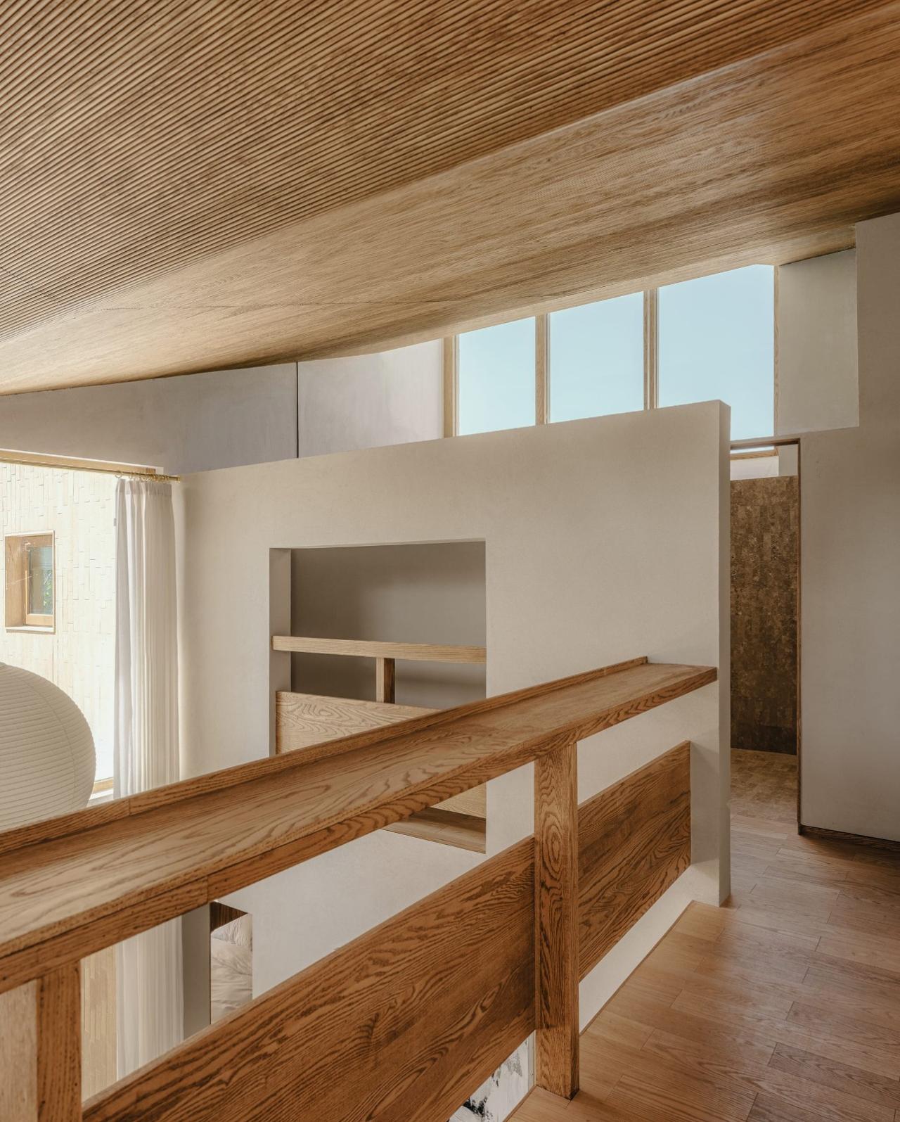 东、西山墙上的凸窗增加了立面的层次和趣味,并连同中庭两道隔墙上的高窗洞形成了“光的通道”。一天中随时间推移而变化的光线沿天花板斜面直达起居空间,让整个住宅从早到晚的活动都充满自然生机。