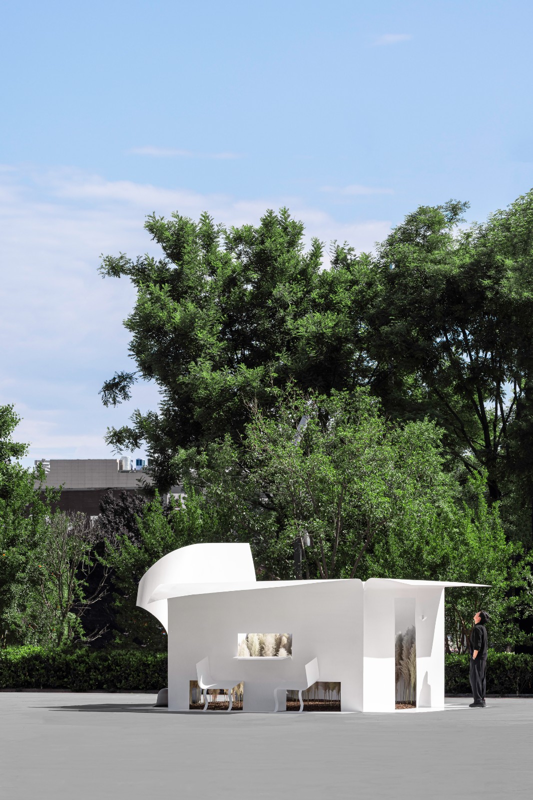 裁剪与折叠形成多个不同大小、高度与形式的洞口,展现出内景的多个视角,由下至上,大地、芦苇、树木、天空、形成一幅幅梦境般的框景。