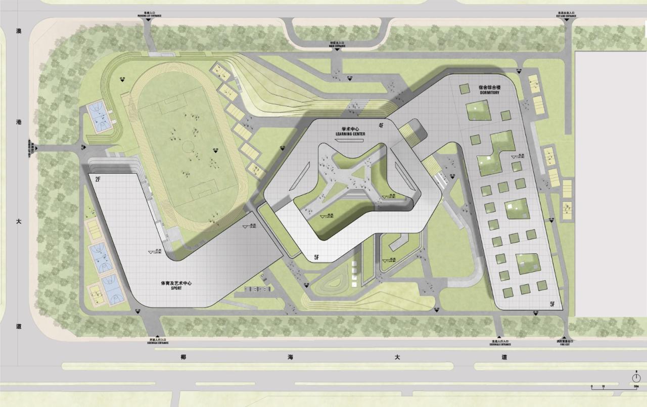 校园的三大核心组成部分海口学校在视觉上由三大核心元素统一:宿舍综合体、体育活动综合体和云形学习中心。校园中心的“学习云”由45组钢柱支撑,容纳了初中部和高中部的教室。云形设计采用流线型轮廓,悬浮于其他建筑之上。它是一个互动学习中心,拥有各种类型的空间,激发不同的学习模式和师生互动。在主要教室下方,你会发现整合的教学区域、图书馆、实验室、创客空间和多媒体教室,所有这些都旨在满足现代教育的需求。