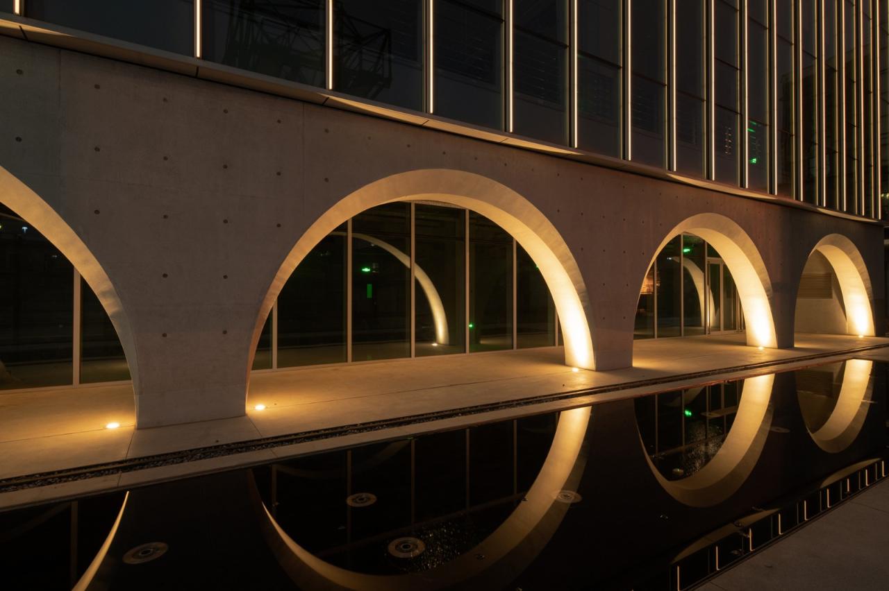 立面采用连续的清水混凝土拱券方式与周围粗旷的工业遗迹形成对比,并将保留的天⻋与建筑结合,不仅形成了独特的建筑形象,还利用其可移动的方式与屋顶形空间成互动。玻璃幕墙和大面积天窗将室外壮观的工业景观引入室内,同时也在建筑外立面上形成映射,产生奇妙空间对话。 室内设计追求最大的空间开放性,将地下一层的一半的空间打开,创造一个 3 层通高的几乎全透明空间,室外的丰富工业景观最大可能地渗透进室内,在紧凑的空间内重组,创造意外的戏剧性。