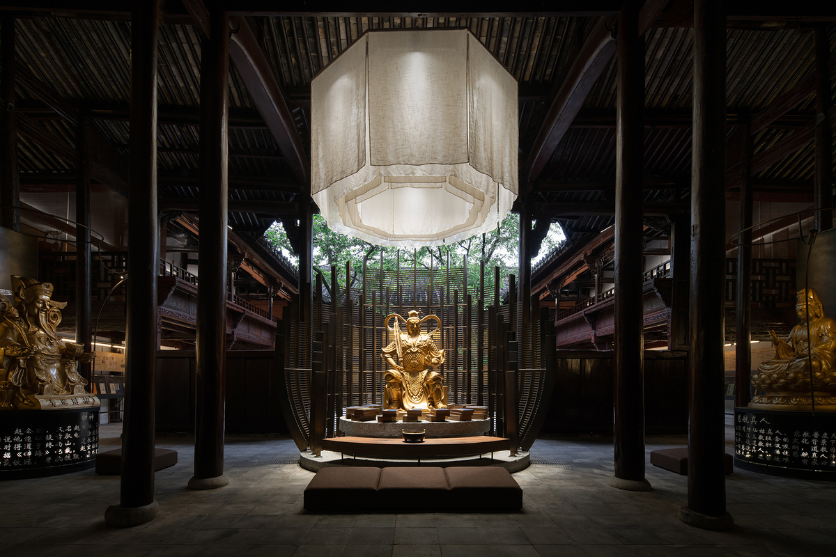 在不增加任何固定墙体、装置的前提下,整个空间以可移动组装物件及模块化组合的方式进行重构与植入,将神像底座、展示架、软饰与灯光的结合作为设计重心。以便在施工过程中达到快速、可实施且廉价、有效的设计目的。