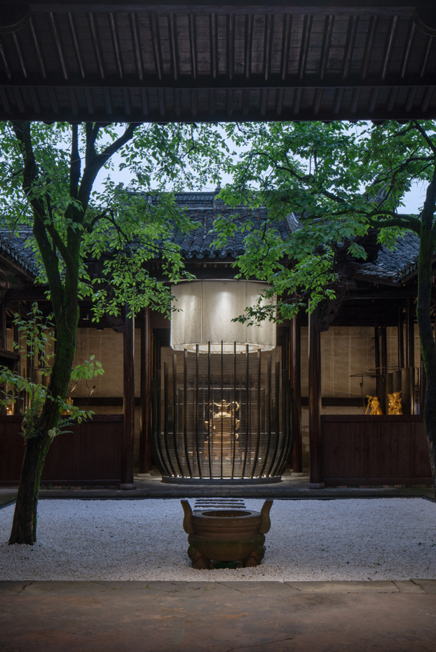 设计方将原本加建的隔断、玻璃进行了拆除,重塑了空间的行走动线,中庭重新进行了清理与重塑,保留了原有院内的大树及水缸,让其成为整个空间的视觉中心,人环绕院落游走。