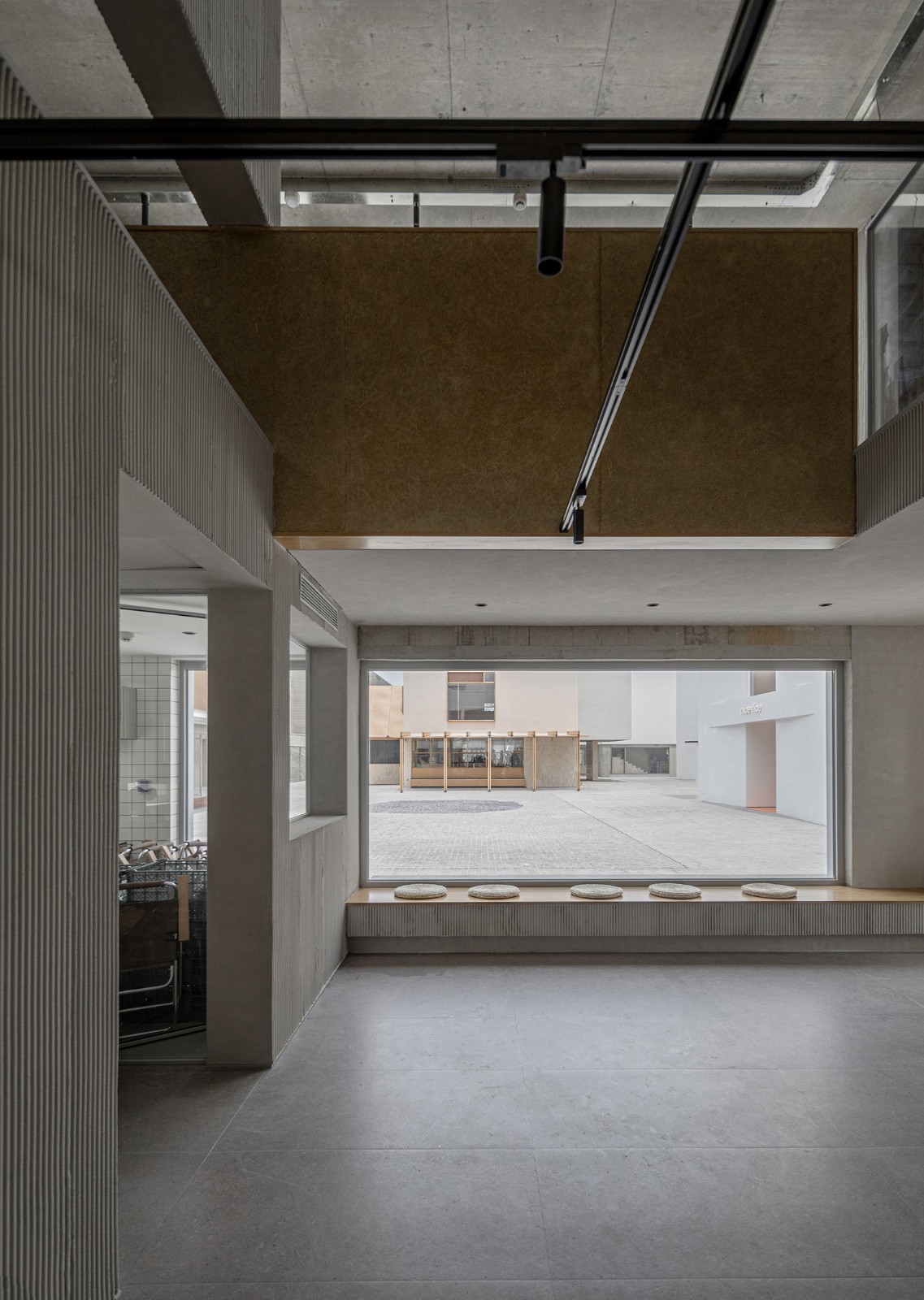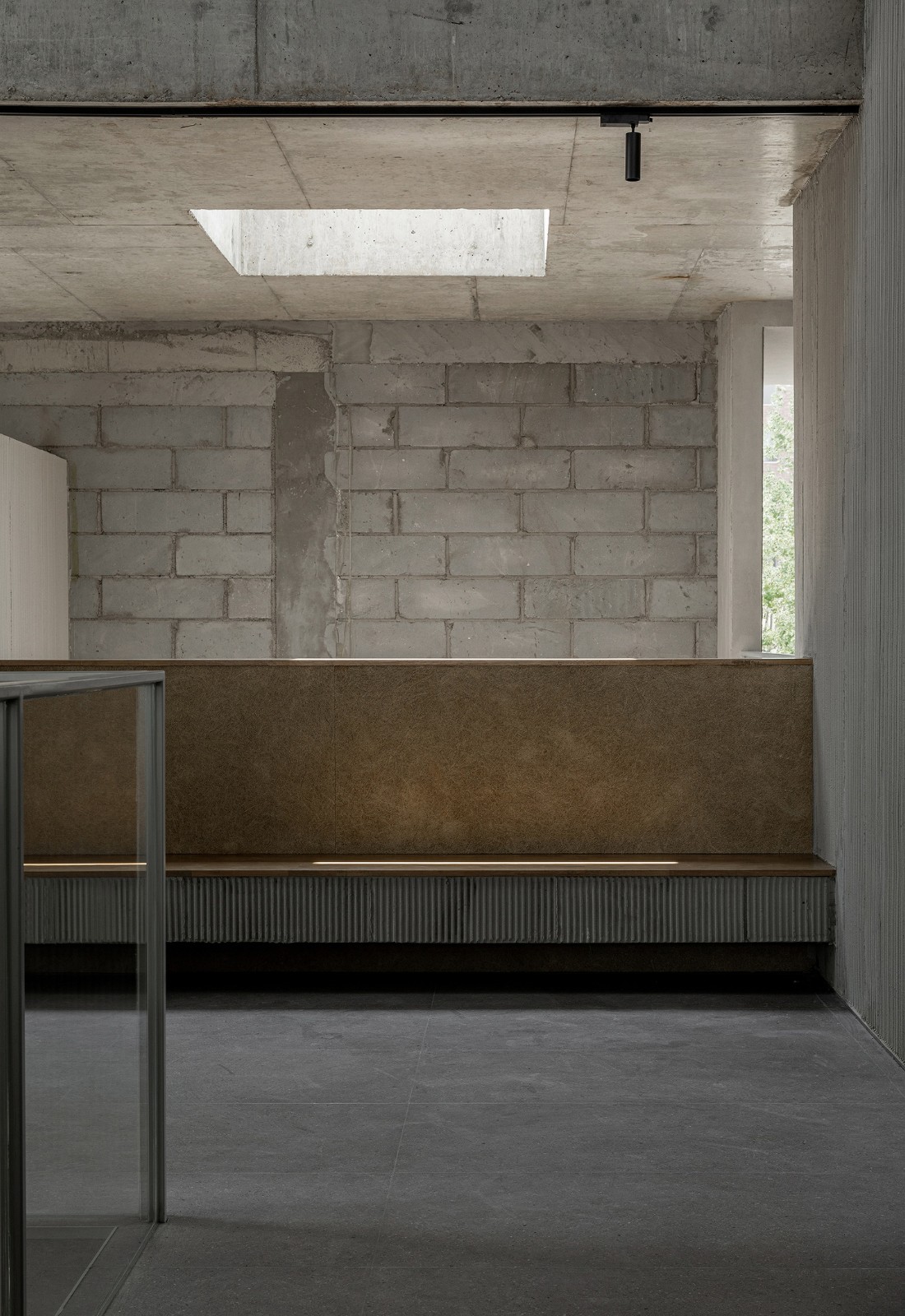对外墙的采光进行调整,使屋面天窗进入的光线成为主角。空间内部的原始结构及墙体全部裸露,新置入的体量以砂浆拉毛为面层材料,在整体质感上保持一致。
