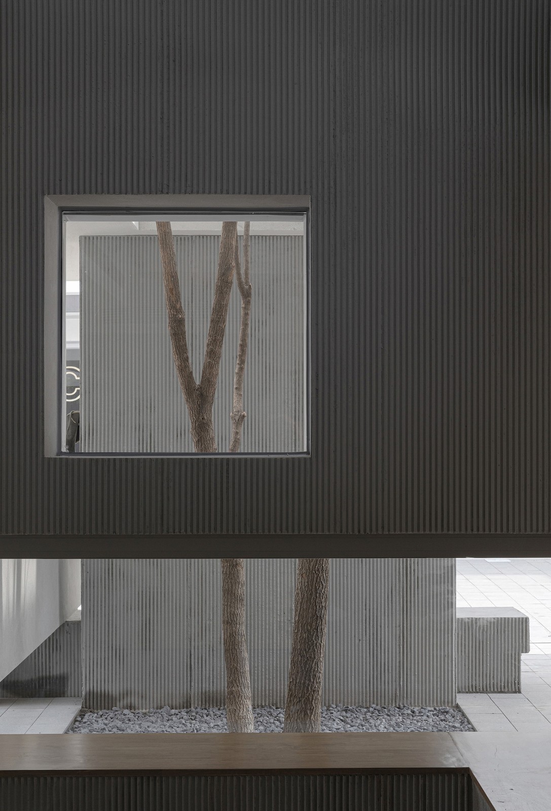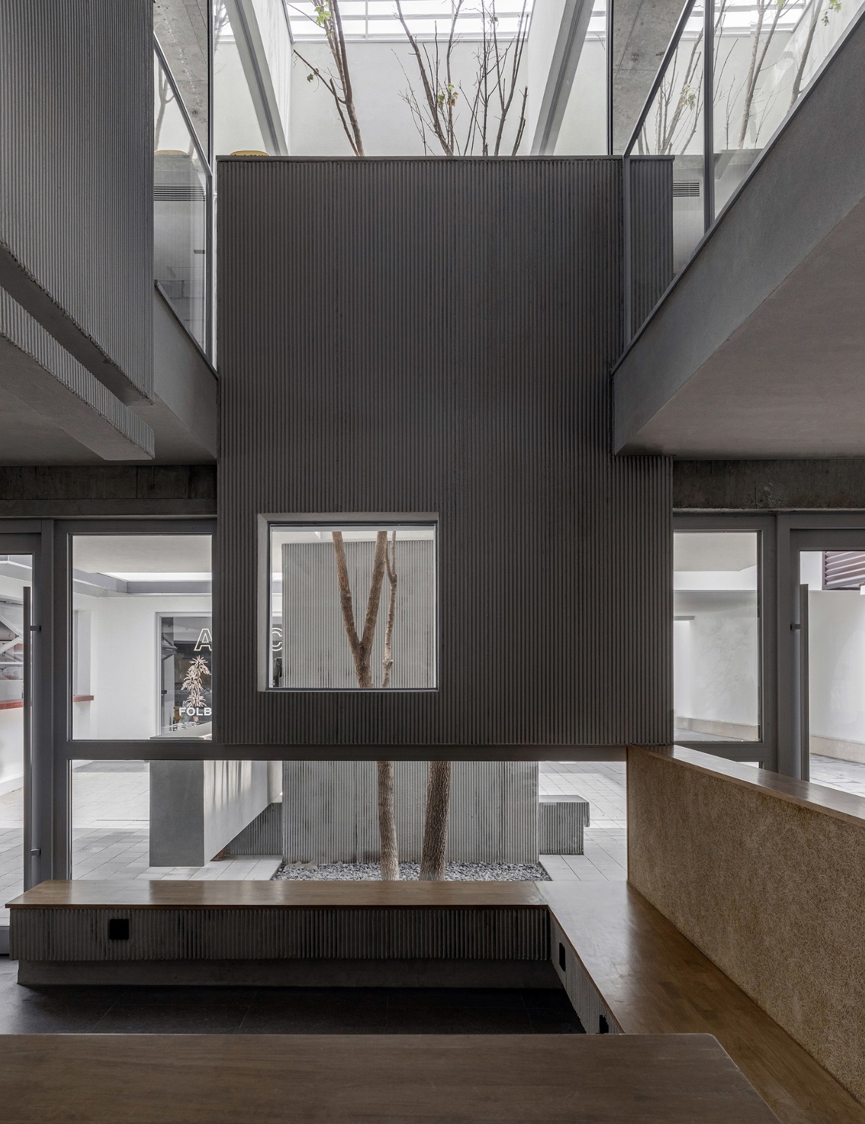 为了削弱层高的压抑感,设计团队置入了几个不同尺度的垂直空间,打破二次结构后相对低矮的平层空间的封闭性,不同向性的空间彼此交错,使得整体空间连续流动。同时,设计团队把东侧局部出挑的方盒子上下结构板打通,得到一个悬浮的中庭,将建筑内外连结。