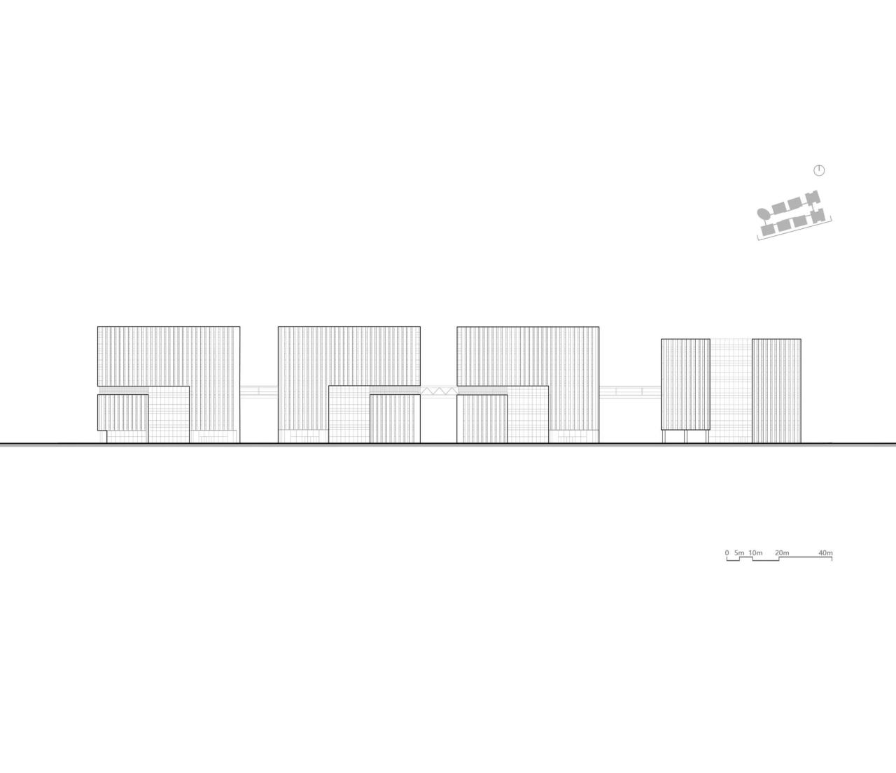 水平方向上,在四层位置,正好是叠拼上下单元相接的楼层设置公共平台层,每个单元在本层设置办公、会议和展示空间等非生产空间,外部平台空间承载了串联所有楼栋的活力连廊。“手拉手”的连接方式,将与功能契合的室内外公共空间在立体空间中贯通,每个楼栋都是整体空间系统不可分割的一部分,形成巨构体系。设计结合建筑的功能特点,赋予不同类型建筑立面及企业单元以个体特征,同时结合园区内外场地差异,体现内外有别。园区外部临主要街道立面采用竖向折板式语言,从综合服务中心到标准化生产车间,由曲线至直线,运用不同角度的冲孔金属板,突出了沿街立面的整体性和韵律感。