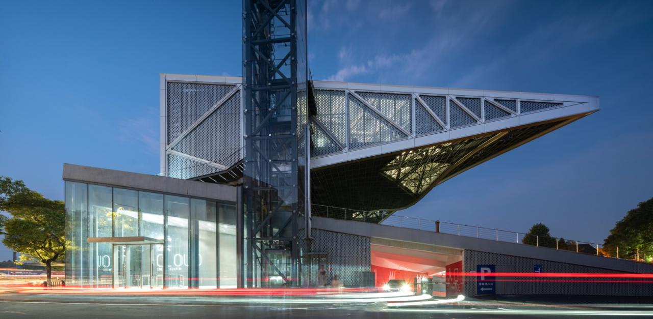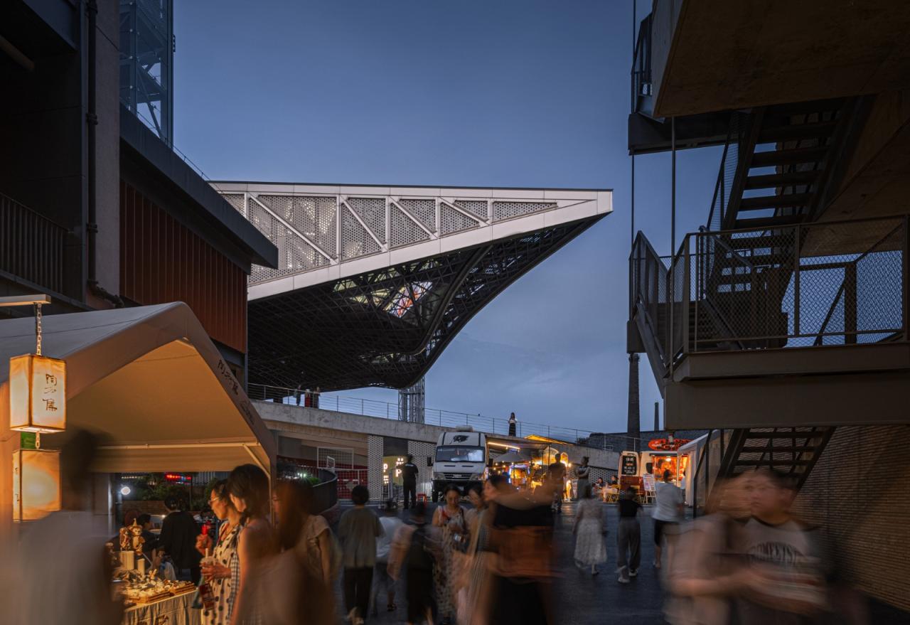 环境共融。作为陶溪川建筑群像之一,“云引擎”和而不同,与周边有紧密的关系。在“云引擎”设计方案初成时,场地西侧的景仰书院的设计也开始启动了。我在一次会议上看到了董功老师静谧的庭院效果图,忽然一惊。因为如果在这岁月静好的庭院里看见这一座探出头的金属机械,那可就不妙了。所以我们将整个建筑体型再向北边平移,并调整了建筑体型切入角度,确保从景仰书院的庭院之中刚好看不到“云引擎”探出头来。这个调整后的平面锐角也加强了建筑透视的张力效果。在现场南侧国贸酒店的大堂处,我们也协同景观起坡做了相似的视觉控制,将“云引擎”的戏剧张力约束这青青草地的范围之内,消隐在周边建筑其各自小宇宙之外。
