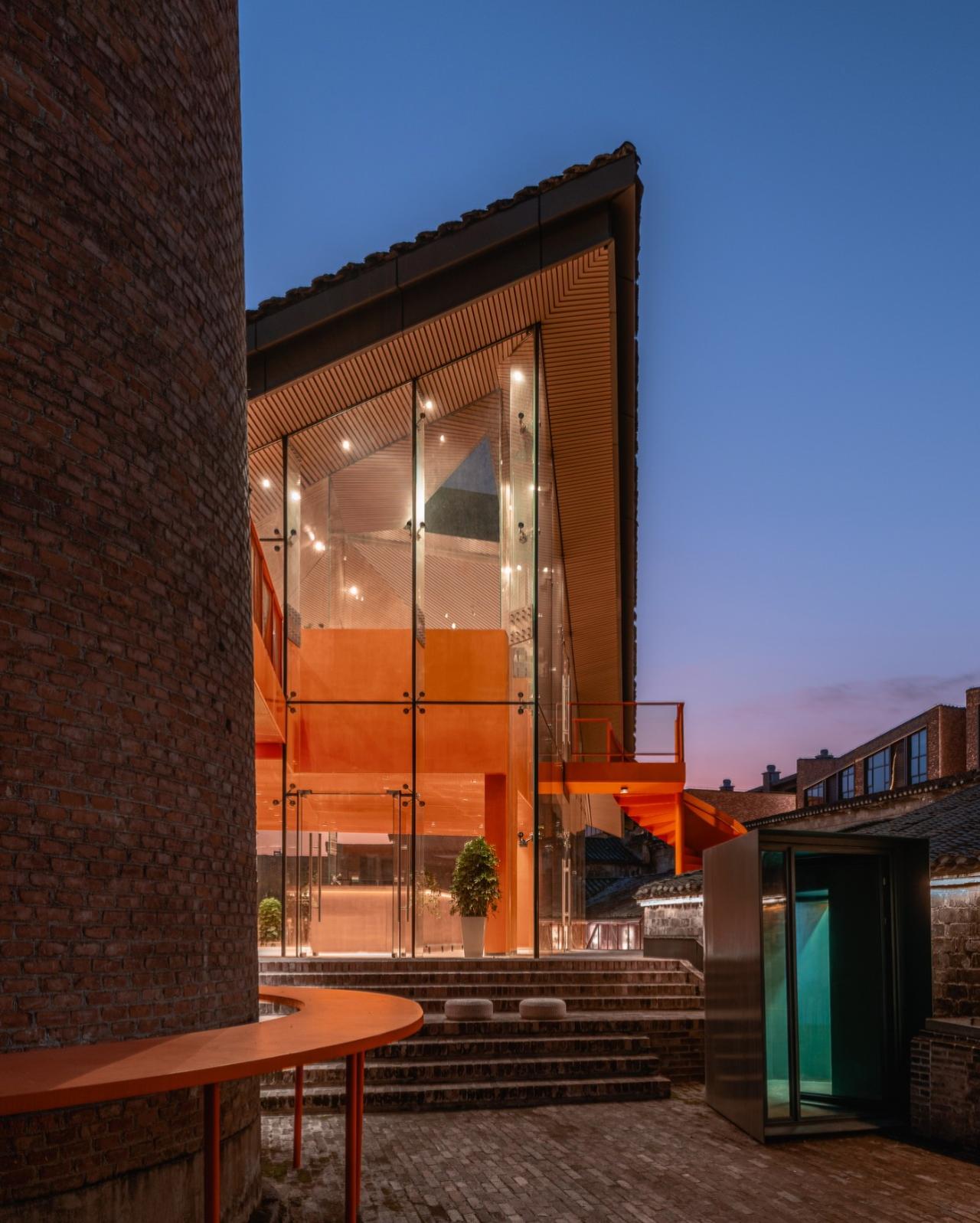 咖啡厅地下一层为砖砌基座,落位于原有建筑基底之上,延续了原有的空间肌理。基座采用砖拱立面和大台阶的做法,是烟筒广场向内院的延伸。同时二层的橙色夹层往烟囱延伸形成室外平台,完成了新建建筑与现有场地完整的锚固。该设计巧妙的融合了新旧元素,在尊重历史环境的同时创造了一个独特而现代的空间地标。