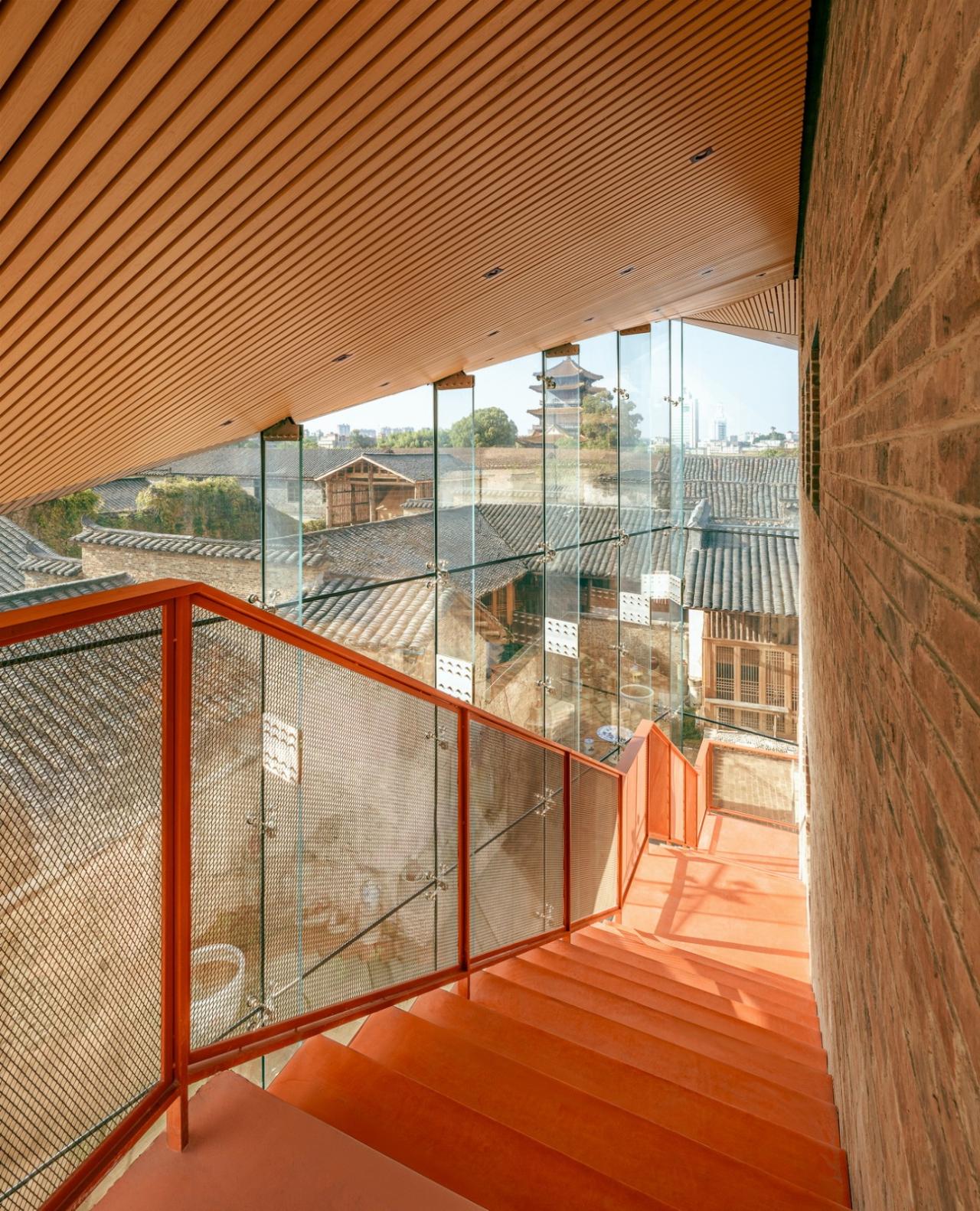 院落改造的插建最重要的是烟筒咖啡厅的置入。一座三层的双坡顶玻璃建筑,包含展览和咖啡空间,在形成标志性的同时,与周边历史环境无缝融合,成为公共空间的重要锚点。玻璃外立面的透明性彰显了一种开放性,与周边坚固的传统砖墙建筑形成鲜明的对比。对角双坡的屋顶采用传统青瓦做法,犹如漂浮的大伞一般。屋顶之下的透明空间,连接了院落内外,是烟筒广场公共空间的一种积极延展。