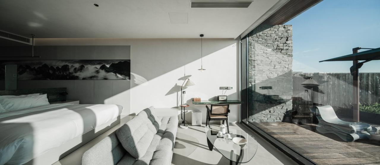 室内设计最大化外部风景的观赏体验,由场地特征提取出来的“翠绿”与“云雾”提炼转换为室内空间与材质的语言,由自然山野强调空间享受。谦和低调的用色与软装,营造人与自然相处的平和心境——“云行不自知,树静谢风迟。行至路穷处,恰是观景时”。