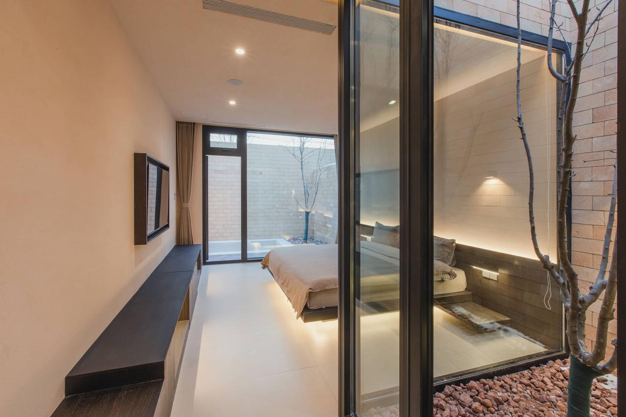 在入口待客区,酒店大堂、休息休闲区等功能空间与院落沿着墙体依次交替在同一轴线上,室内外同种墙体饰面的使用和超大尺度玻璃推拉门,使得室内空间与景观庭院层层递进,室内外的边界被弱化消弭,人行其中,在连续的空间中流动。