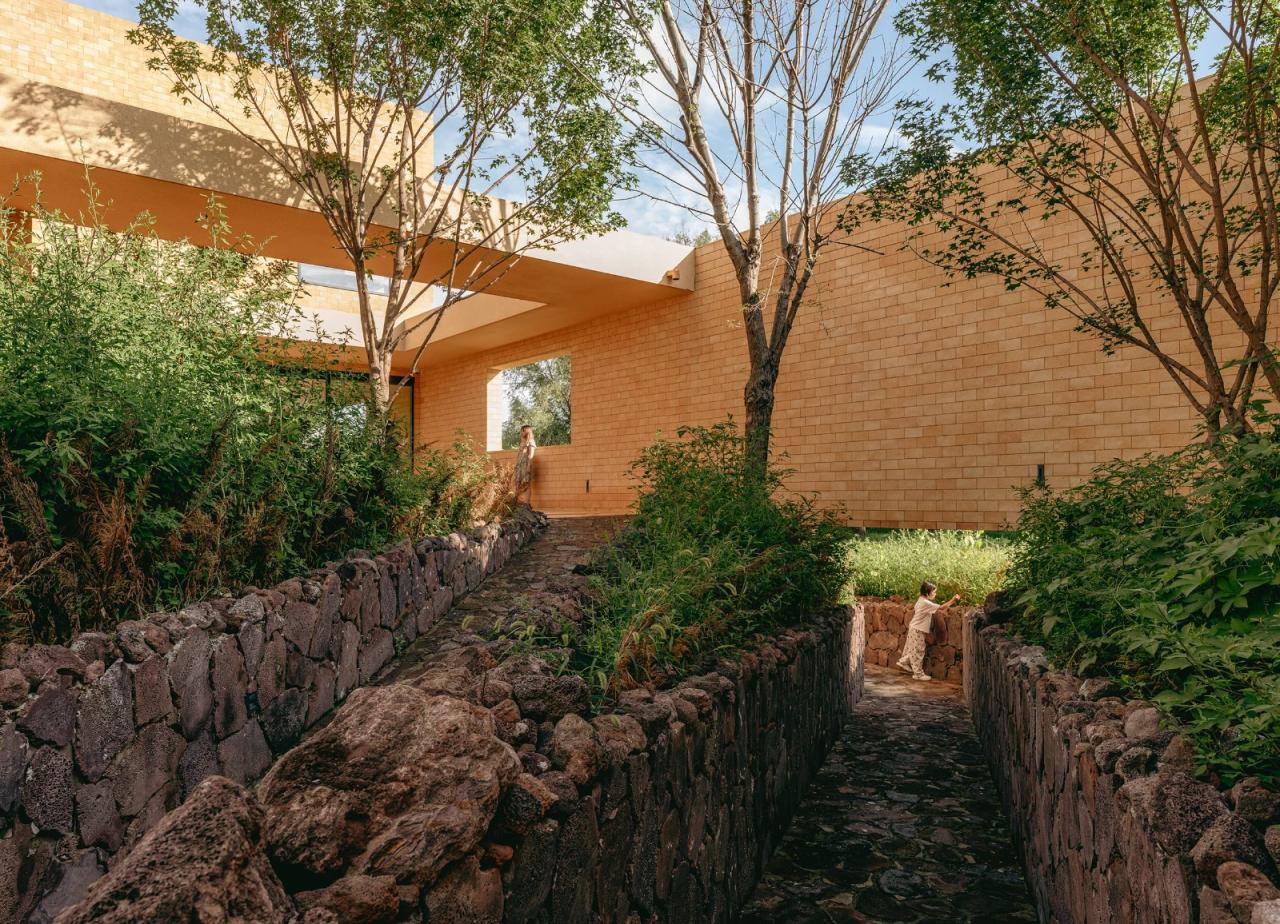 由于场地标高高于村路将近2米,我们借势将这道连续的外墙抬离地面,墙体落于场地标高,但高悬于村路之上,利用场地与村路之间的标高差异,形成一人高的空隙作为酒店主要入口。抬高的墙体为酒店内部与周围环境创造了自然过渡空间——住客穿过树林,从自然环境中钻进院子,沿着坡道迂回向上,抵达酒店大堂。