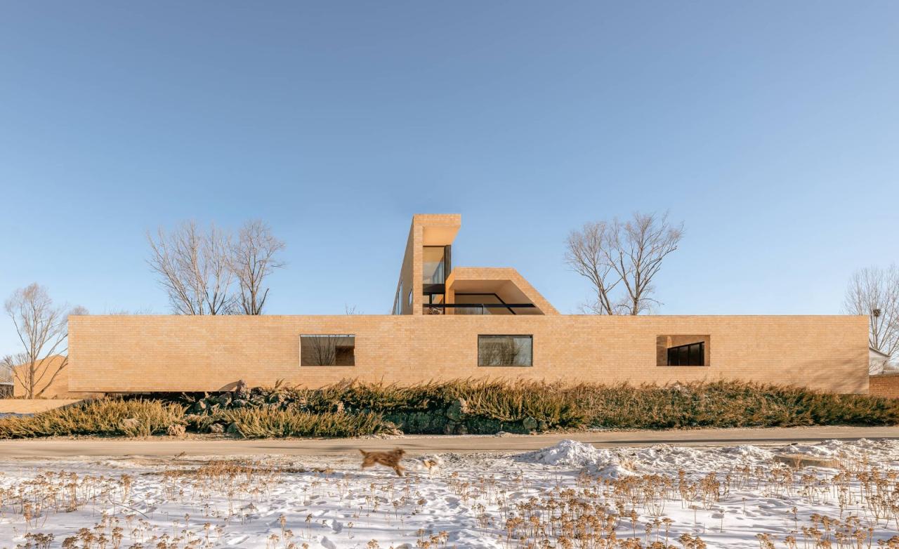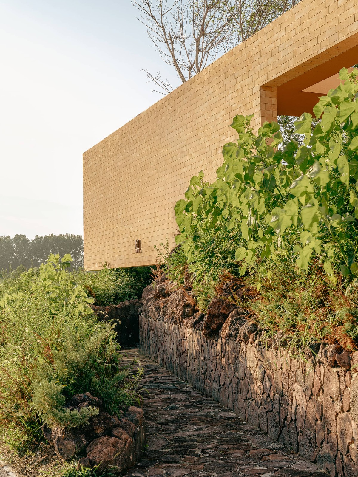 给酒店大堂的二层设置室外景观露台,视线面向西侧柳林与野鸭湖方向打开,绿意葱葱尽收眼底。景观庭院作为乡野风景的延伸,墙上的方窗同样会框出西边的夕阳与枝条。对场地原来的树木位置进行准确定位后,在院中重新配置植物,还原过去场地里枝叶间的风声,也为连续的空间节奏打下松弛的节点。