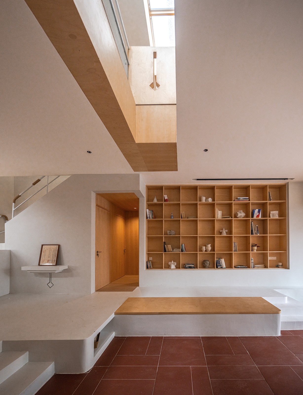 画室设在老房子框架内,保留历史墙体,引入北向天光,提供充足自然采光。主卧设有独立卫生间,结合窗口形成多种功能,确保隐私与便利。客卧和宿舍家具结合不同卧室功能,形成多样的空间使用。 在梁家庄村的建筑项目中,传统与现代融合展现了独特的建造性。施工过程中,采用土办法应对材料采购困难和当地施工水平限制。
