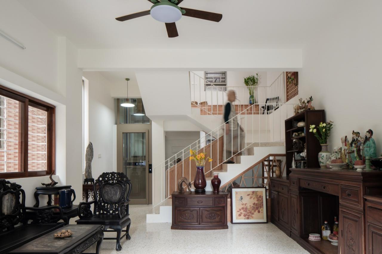这是顺德一个五口之家的住宅,夫妇二人是镇上的职工,儿女刚成年,爷爷虽上了年纪但精神很好。场地位于镇中心,周围的宅基地也都以业主自住为主,属于珠三角典型的自建房街区。宅基地为8米面宽,10米进深,北侧南侧为通行窄巷,西侧为不通行窄巷。仅东侧视野采光较好。