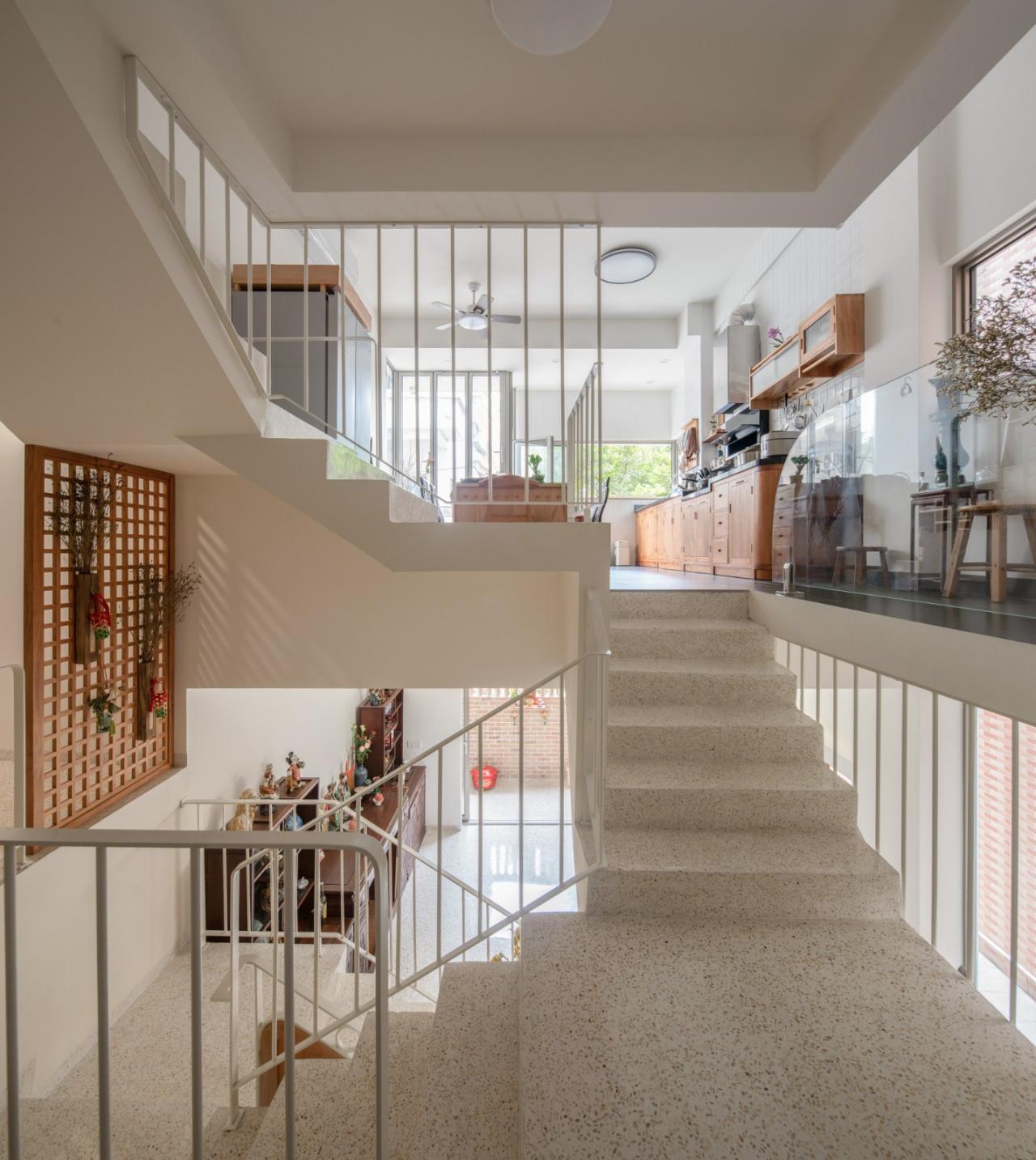 二层是餐厨和爷爷卧室。餐厨用口袋外的1.8米来观景,爷爷卧室则用这1.8米退出了阳台,能从户外走进餐厨。西侧为爷爷单独做了晾晒阳台,也使得A3柱显露。以上关系使得爷爷在家中时常处于游走状态。