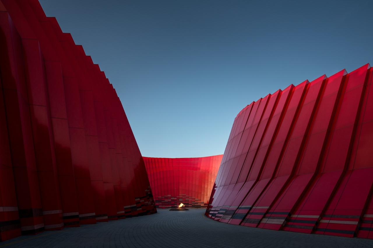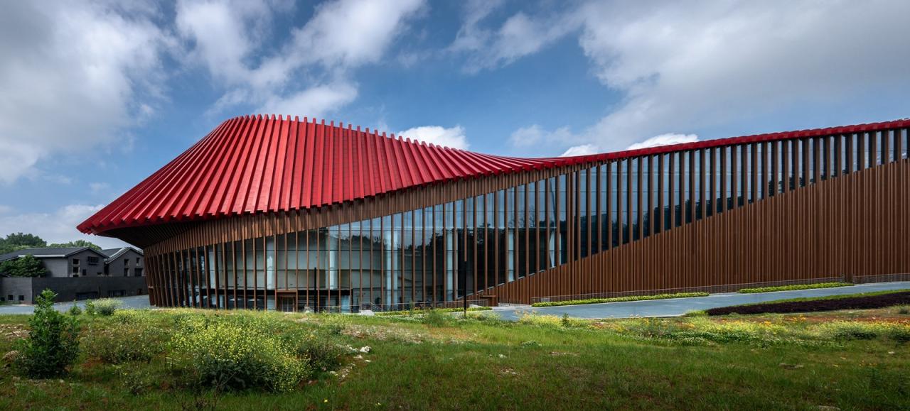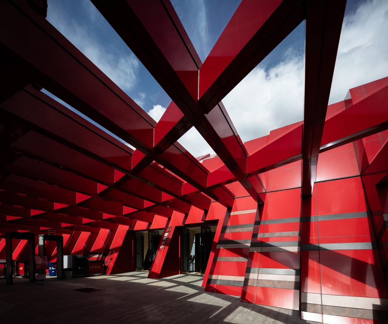 红飘带材料采用当代技术,在红色的基础上反映天空大地丰富多变的色彩,使得单一的红色变成和环境与人更加贴近的、随时间变化的丰富色彩,给传统的“中国红”带来了更多的可能性。红飘带采用参数化设计使得曲线流畅过渡,并结构支撑钢架中间保留了缝隙以引入天光,形成了一个光影丰富的环廊空间。