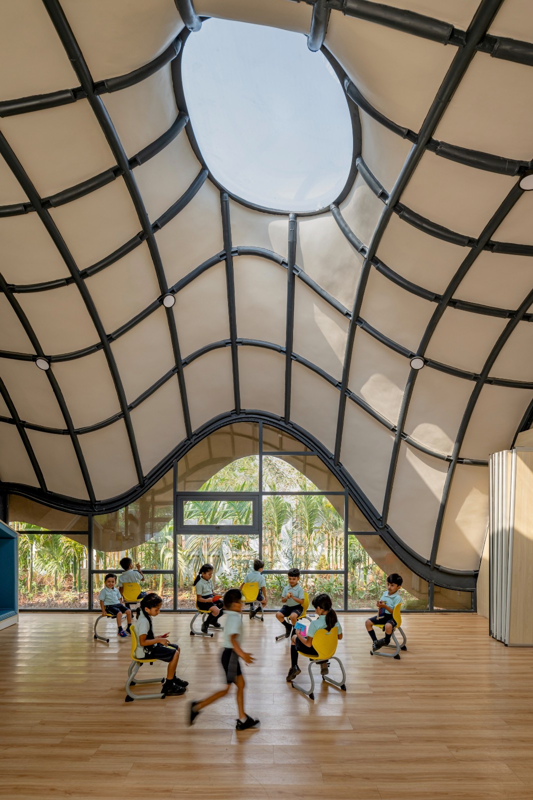 在一个传统教育体系占主导地位的地区,维贾亚瓦达的布鲁明戴尔国际学校凸显了参数化建筑在推动教育边界和挑战传统规范方面的变革力量。这是印度安得拉邦第一所也是唯一一所国际学校,这所国际学校具有以下特点:其核心价值理念是提供非传统的教育模式;目标是通过建筑设计为早期教育带来范式转变。