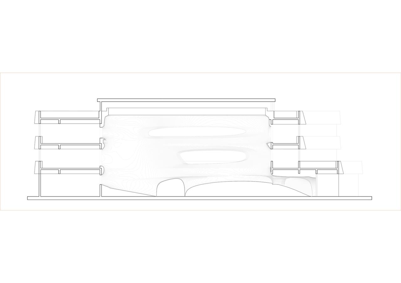 阳光充盈的中庭,曲面将孩子环抱,既是空间的中心也是探索的起点。中庭流畅的的曲面形态和肌理,让孩子们宛如置身河谷中央。亲和温暖的木纹肌理,让每个孩子随性触摸。不同大小形状的洞口,是发现好玩之事的前哨。连接中庭和各个功能房间的走廊,互相对望的楼梯窗口,为孩子创造更多的活动惊喜,是空间中的缓冲和联系层,也作为“大树”这个意向中“枝杈”的存在。