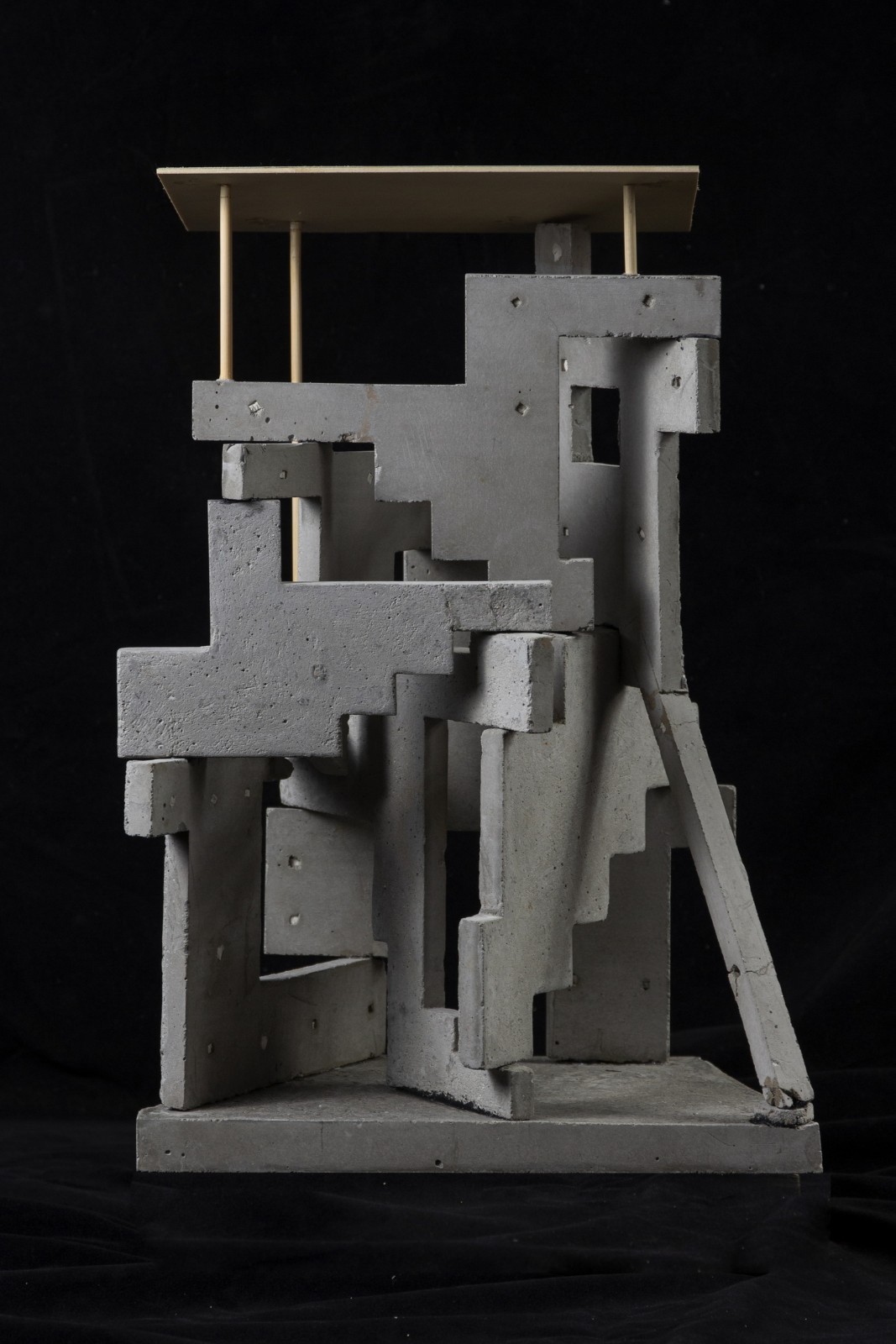 空间与建造垂直自然塔由九片形状不一的混凝土墙体相互搭接形成主体空间,并在其内部设计了一条螺旋上升的路径通往建筑顶部的“亭子”。在创作过程中,建筑师对这九片混凝土墙体所表达的“搭接的随机性”进行了“刻意”的技术处理,尽管混凝土墙体的建造本身是“凝结”而非“搭接”逻辑。所谓“搭接”,即每一片墙体顶端的结束和另一片墙体底端的开始须位于同一标高。而实现“搭接”的视觉语言则是将一个由暗柱和暗梁组成的连续框架结构隐藏在这九片墙体中。“随机性”的墙体对于施工建造是一次不小的挑战,施工方在现场制作建造模型以保证建造的准确。