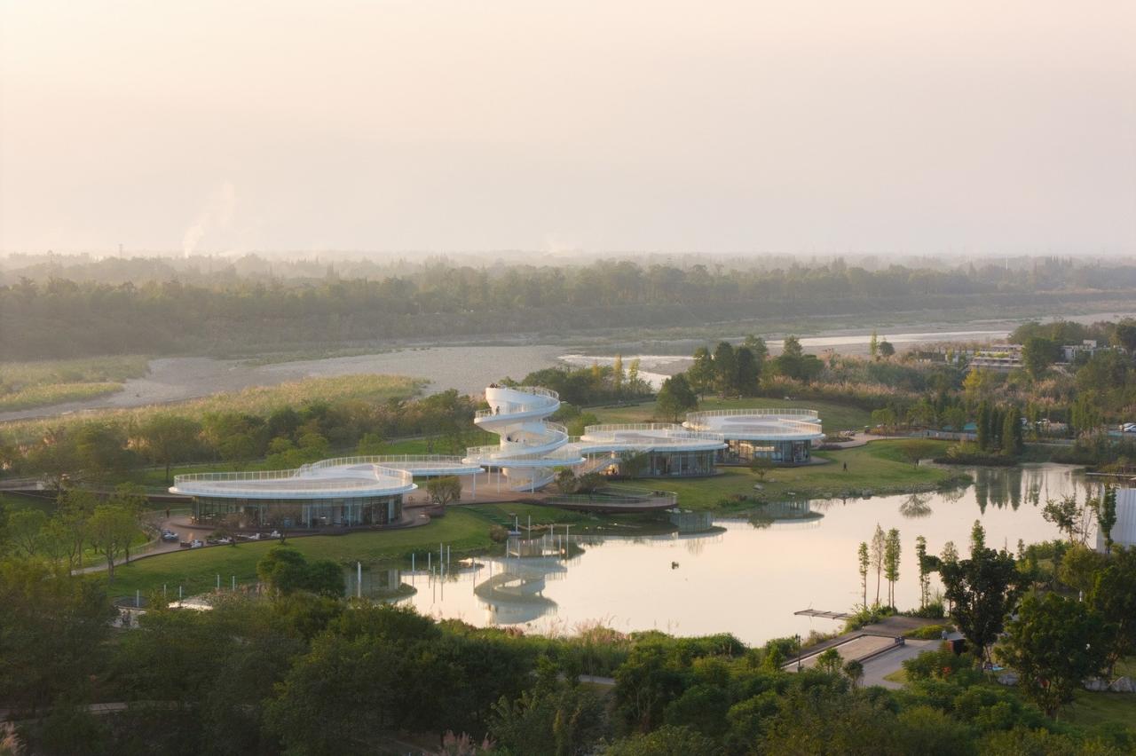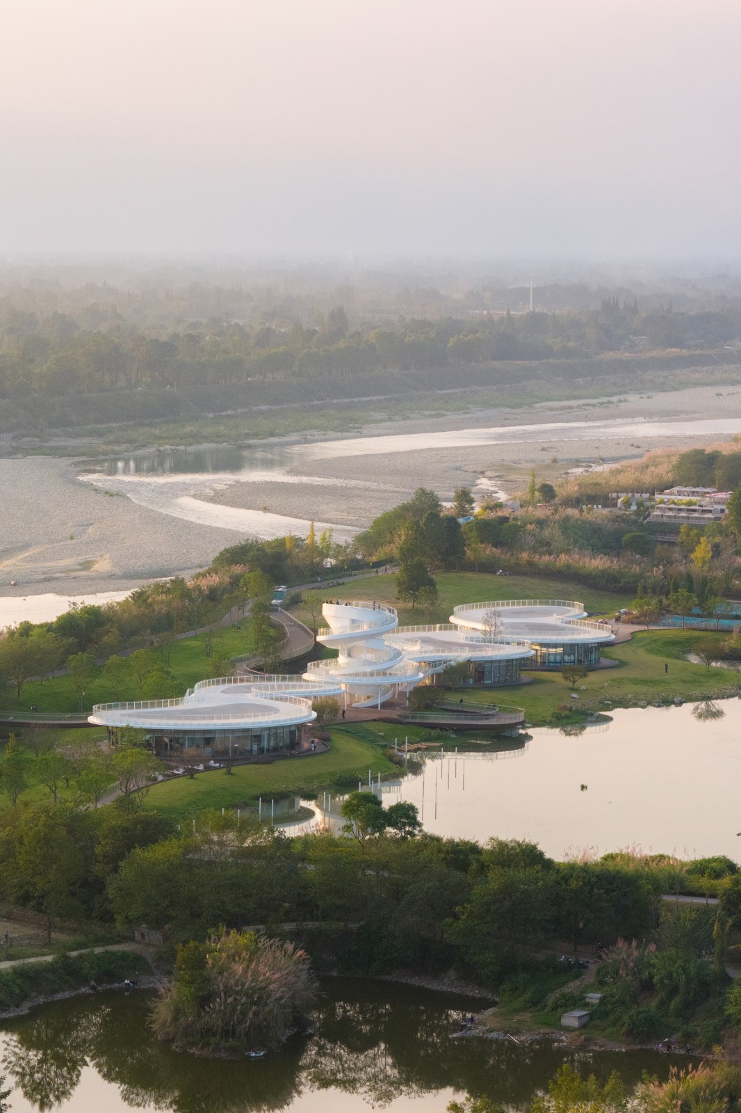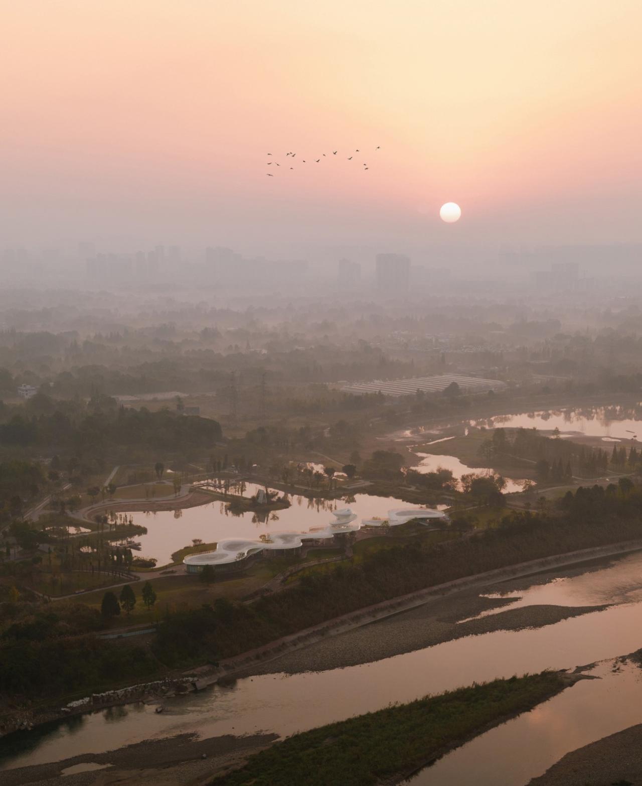 河流是人类文明的摇篮,其形态记录了时间的沉淀与自然的变迁。金马河作为都江堰主要排洪河道和岷江干流的重要支系,其历史与功能象征着人与自然的深度联结。MUDA 慕达建筑从金马河的河道肌理汲取设计灵感,通过抽象转译,提炼出充满流动与韵律的自然曲线并注入建筑形态。建筑以现代化设计语言回应自然场地的生态性,同时彰显了温江这一在地文化的独特魅力。