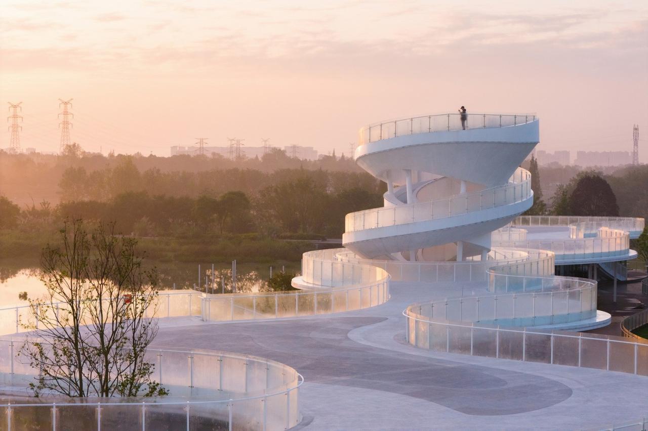 设计从中国传统园林中的“亭”这一空间原型入手,对“顶”与“柱”的关系进行现代化演绎,形成轻盈通透的建筑轮廓。流畅的曲线源自河滩肌理的抽象转译,水平屋顶由白色金属钢板包裹,立面采用通透玻璃材质,呈现出建筑“漂浮于水面”的视觉效果,仿佛融入湿地的自然场景之中。