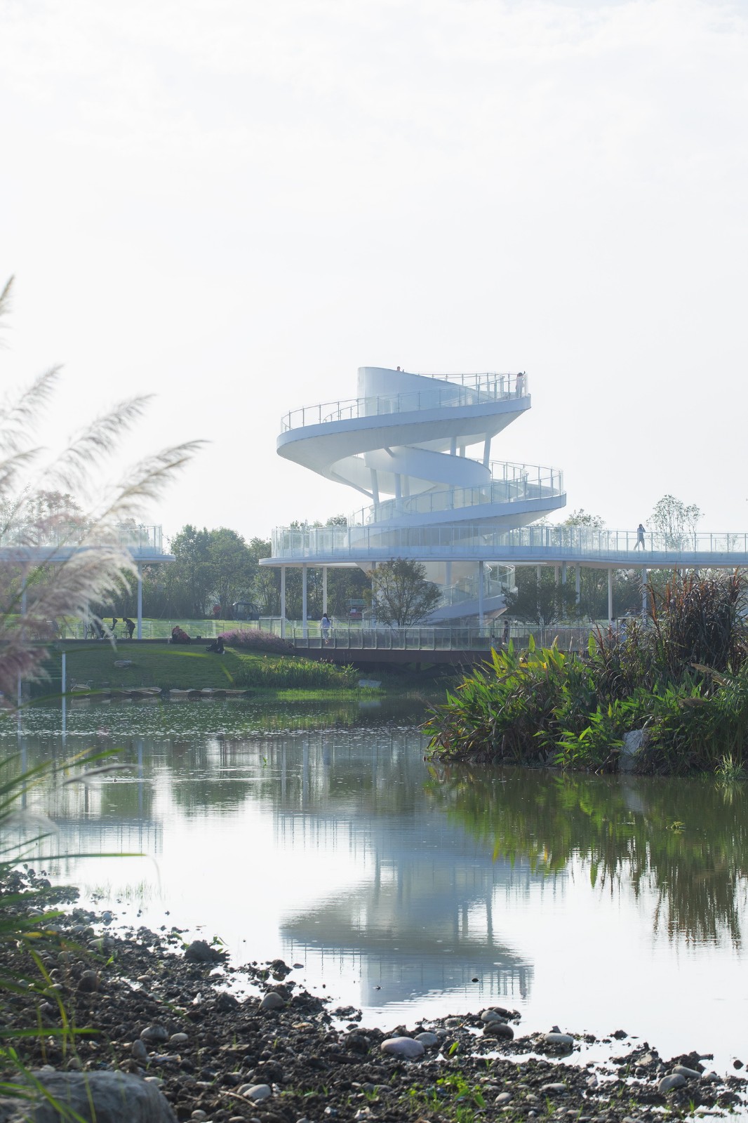 观景塔以缓缓盘旋的双螺旋楼梯设计为核心,从塔底拾级而上,游客可以在攀登过程中感受不同视角下的湿地美景;塔顶作为“望见龙门山”的绝佳观景点位,不仅能够 360° 俯瞰湿地全景,更可远眺雪山山脉的巍峨身姿,为游客带来独特的沉浸式自然体验。