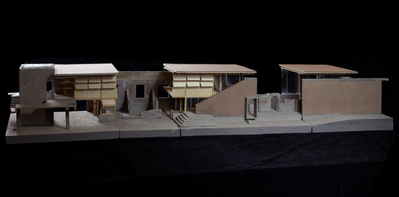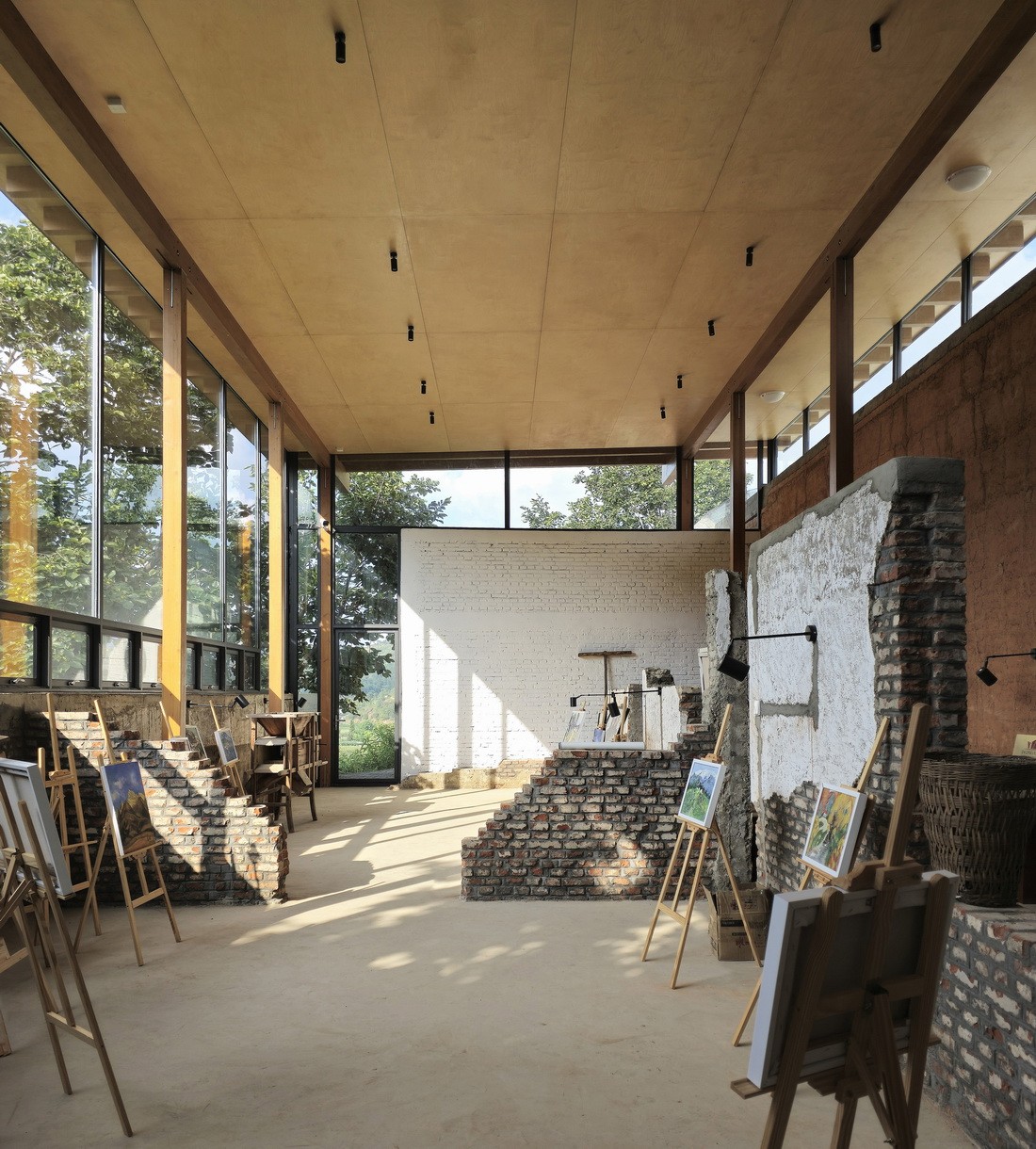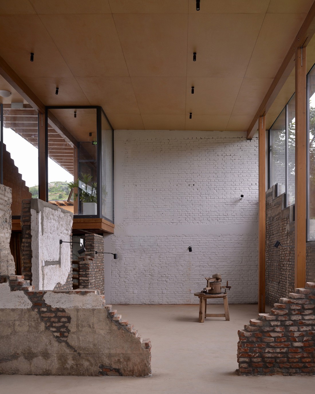 建造的策略来自现场所建立的直觉,即在遗迹中建造。设计团队希望新的建造是历史的一种延续,而非抛弃,即便旧的建筑已无法适应新的功能。设计团队保留了现场尚能使用的建筑结构,但将旧建筑中危房的结构板拆除,保留其原先的砖混结构的墙基。而新的建筑结构为木结构体系,建造在原有结构墙基之间的的空白处,形成完整独立的新体系。于是,当完成建造之时,整个建筑便拥有了两套相互交织的轴线体系,一套是新建筑的木结构体系,它支撑了整个建筑,并为室内功能留出了自由空间划分的可能性;而另一套轴线来自于老的砖混结构的墙基,它同样参与到了室内功能的格局,成为功能划分的一项重要线索,同时也给历史和记忆留出空间。