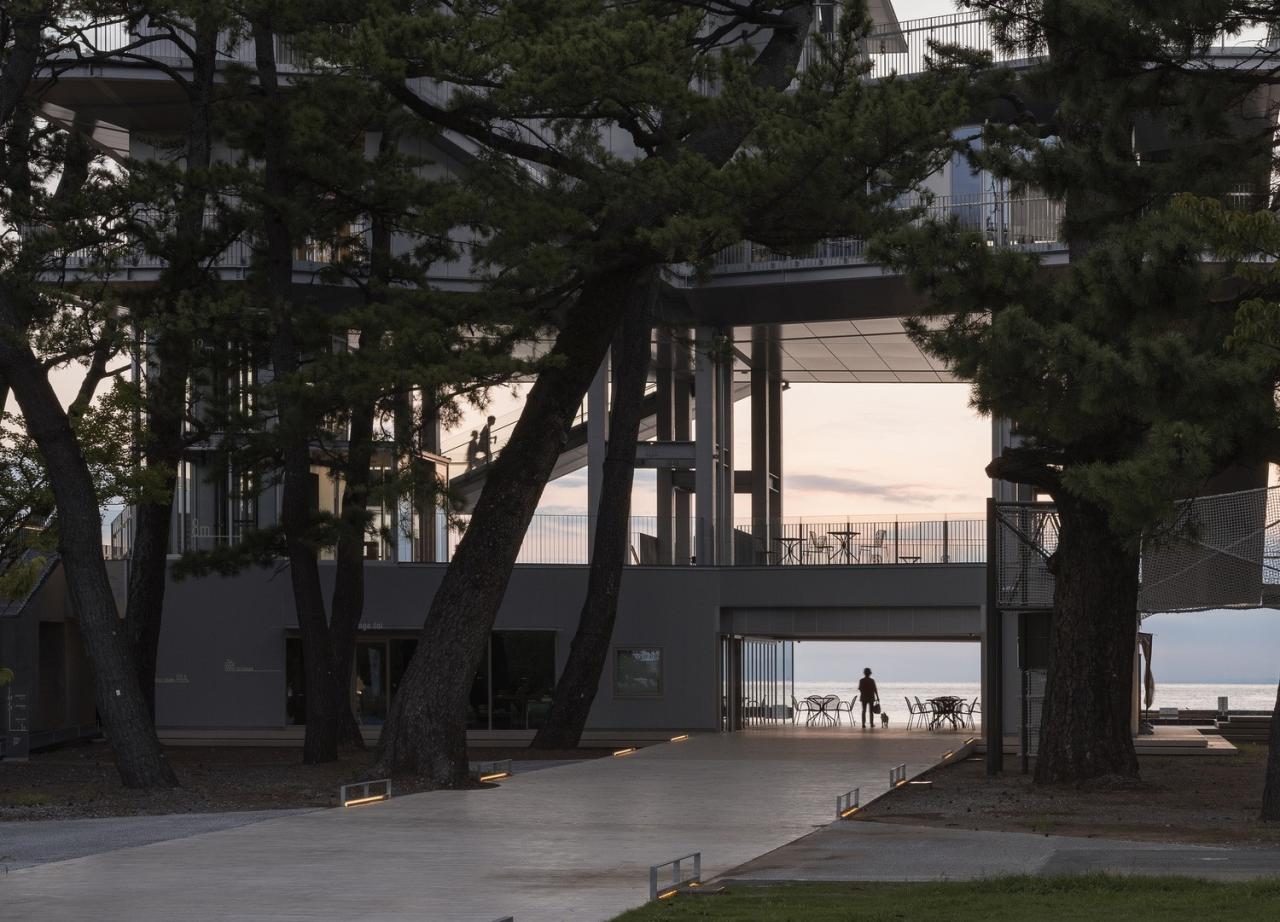 该建筑战略性地坐落于海岸线与松原市中央公园——松原公园(松林)之间的边界上,象征着城镇与大海之间的门户。由于松林是该地区风景的标志性元素,建筑的设计便围绕这些自然元素展开,避免砍伐大直径的松树。建筑布局采用了弯曲松树的3D扫描图像,使得建筑能够与树木共存,同时提供必要的疏散楼层面积。由此产生的设计旨在创造一种与现有环境和谐共存的新景观。
