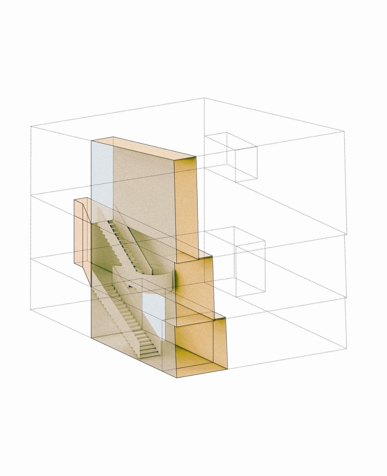 为了将三个楼层更好的地联系成一个整体,一部分楼板被取掉,形成了垂直向上连贯性,这里既是楼梯间,也是一层入口处的开放前厅。