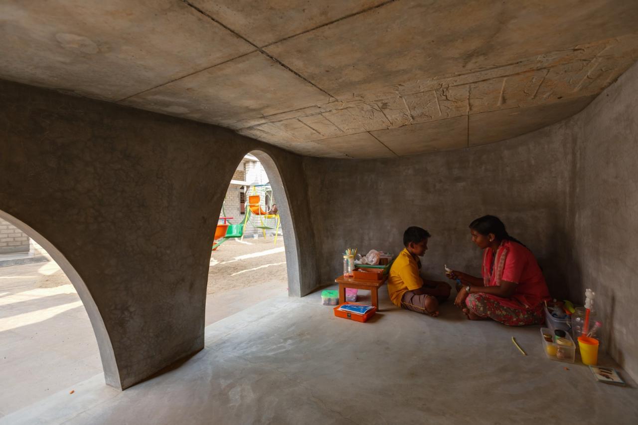在炎热的蒂鲁普尔气候下,两个庭院均覆盖了张拉膜遮阳篷,为游戏和集会提供舒适的开放空间。后庭院的设计旨在促进有组织和非结构化的游戏,通过感官路径和景观元素,以平和的方式激发学生的感官。一座跨越小池塘的桥梁通过游戏培养学生的平衡能力,而用于团体和个人活动的区域则鼓励灵活的互动方式。传统的游乐设备,例如秋千和滑梯,与这些感官功能相辅相成,共同营造丰富的游戏体验。