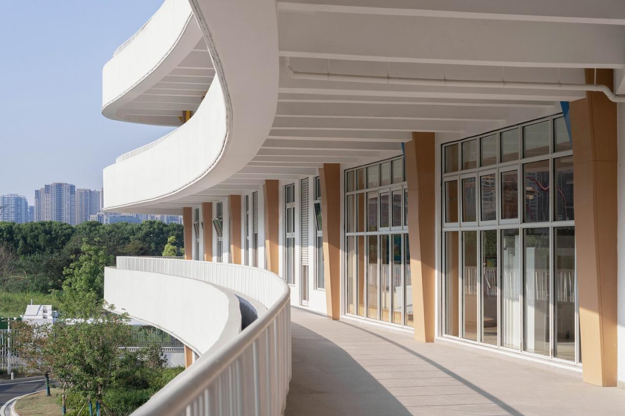 南北向的中心位置设置了教室这也有利于教室采光,东西向的中心位置设置了垂直交通和开放空间,南北教室的学生在这里有了相遇交集的场所。悬挑的平台不仅起到了遮阳及教室更好的通风做用,暑热、风雨天小朋友也可以在平台上游戏活动。外廊端口部设计了可以种植花草树木的凹槽,可以让户外绿植景观过渡延申到室内。