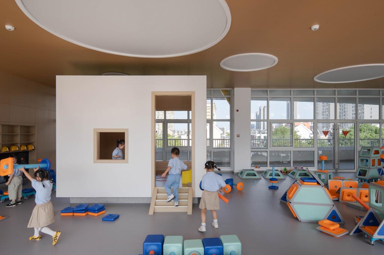 幼儿园的空间尺度非常重要,大尺度的“回”字形建筑里也充分考虑到了小孩子的空间尺度。尽可能压低的层高增强了水平向的空间张力。靠近上下垂直交通处设置了开放的木屋、亭台、运动等空间,空间尺度的变化给小朋友积极向上的精神。