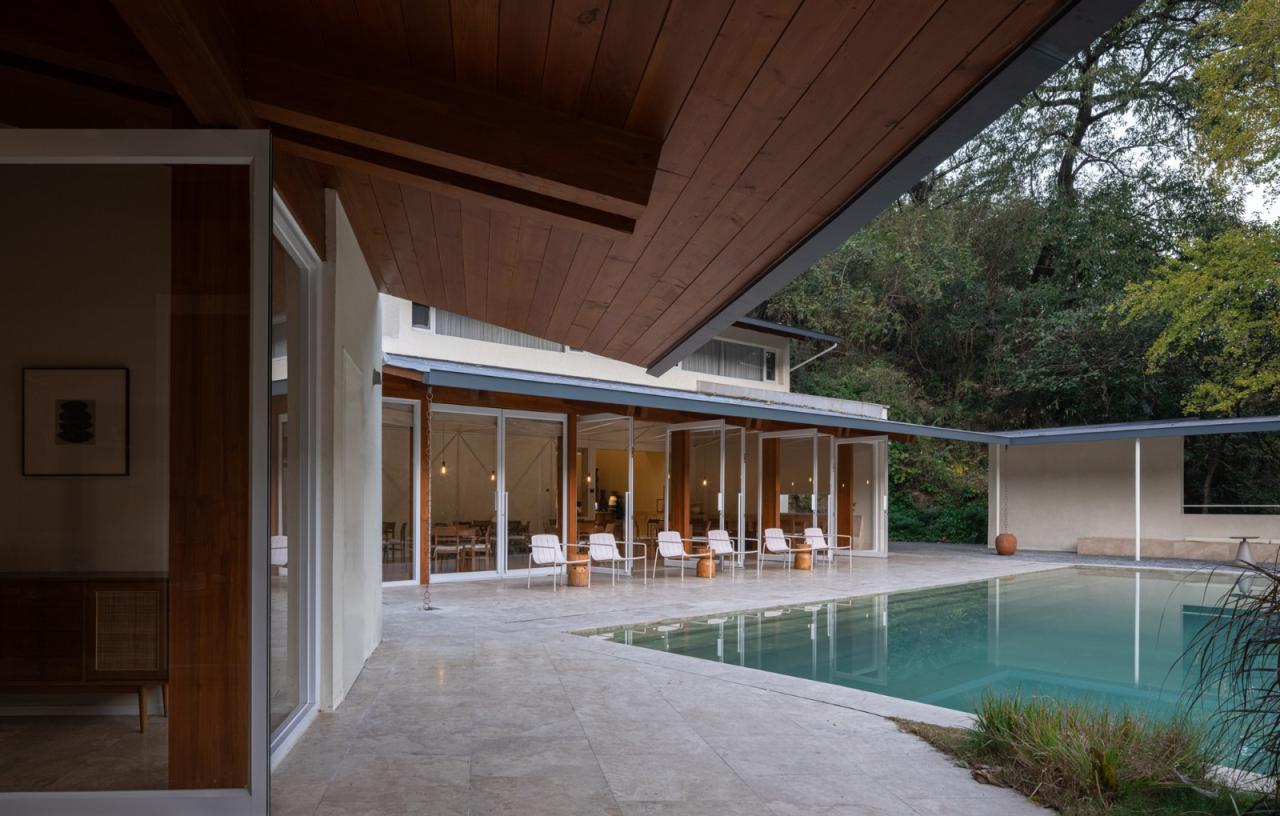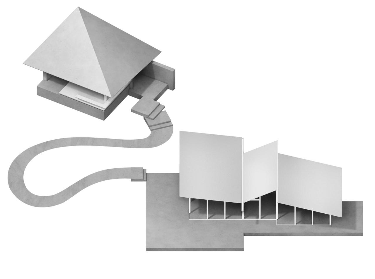 新造的前厅居台地之上,延续原场地三合院布局,两级屋顶一高一低、一前一后导向中心戏水池,平缓的坡度再次强化内院的围合感。一系列景框与人的行走路径相联系,原本有限的室内空间因景框的存在得以释放。
